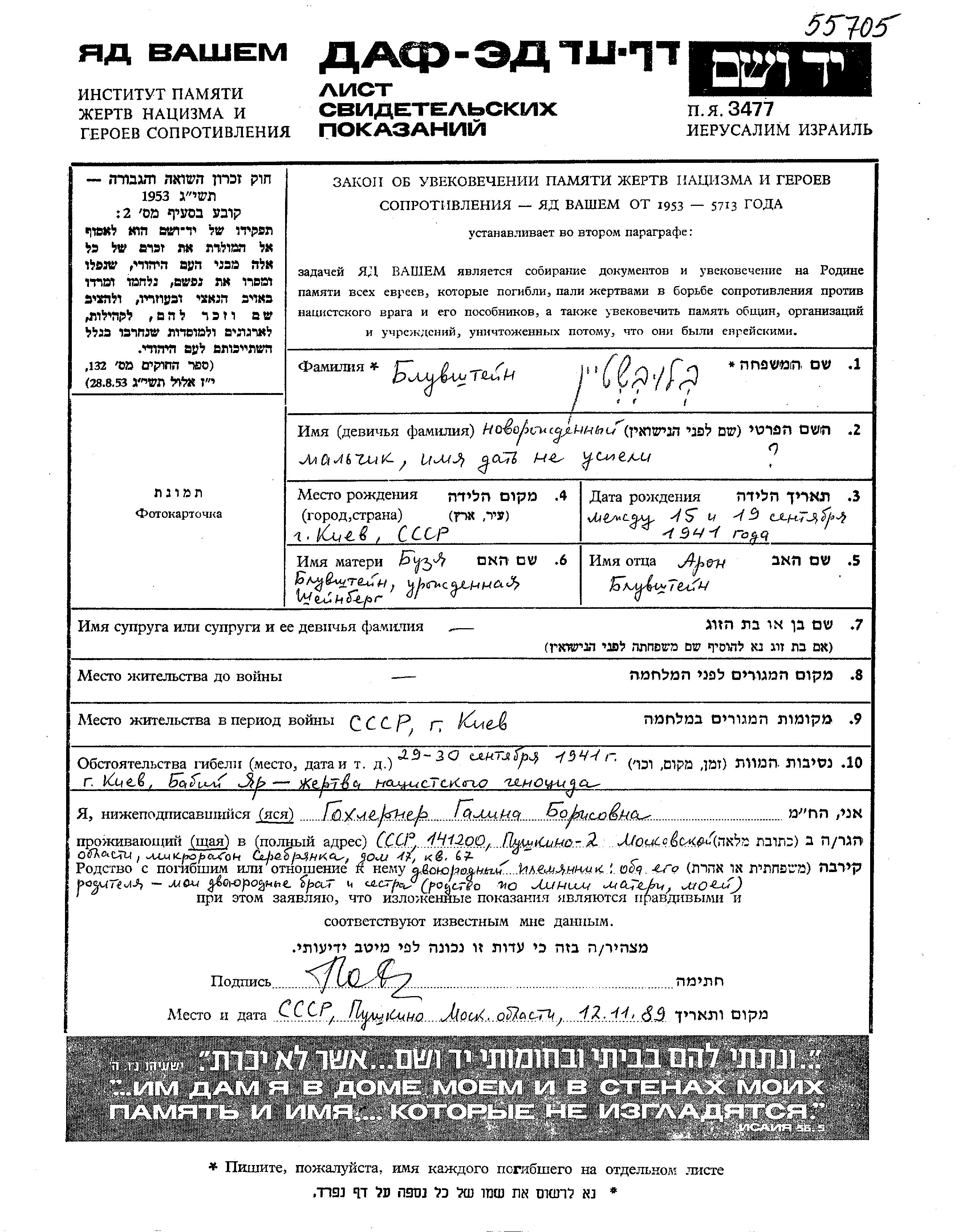 Bluvshtein Vorname unbekannt 1941 unbekannter Ort, Gedenkblatt