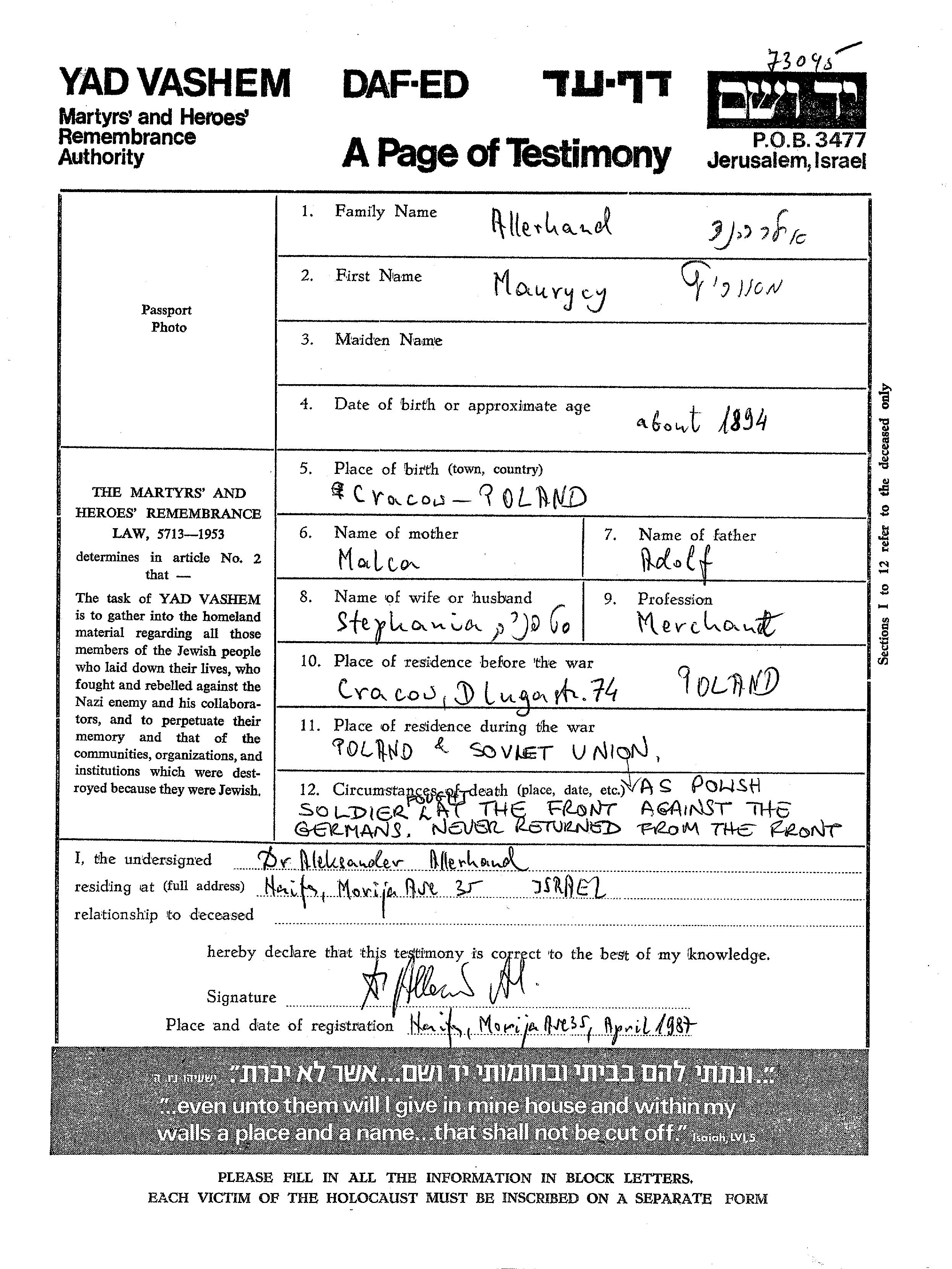 Aufenthaltsort während des Krieges/Schoah