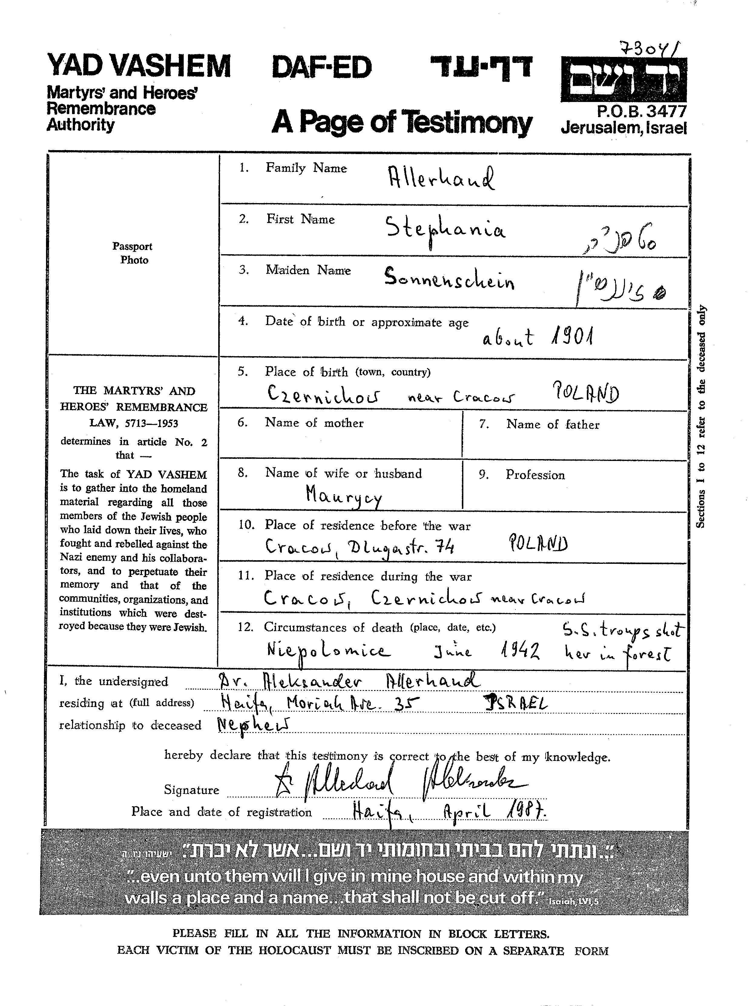 Stephania Allerhand, geb. Sonnenschein wurde im Jahr 1901 in Czernichow, Polen geboren. Sie war mit Maurycy Verheiratet. Vor dem Zweiten Weltkrieg lebte sie in Krakow, Polen. Während des Krieges war sie in Czernichow, Polen.