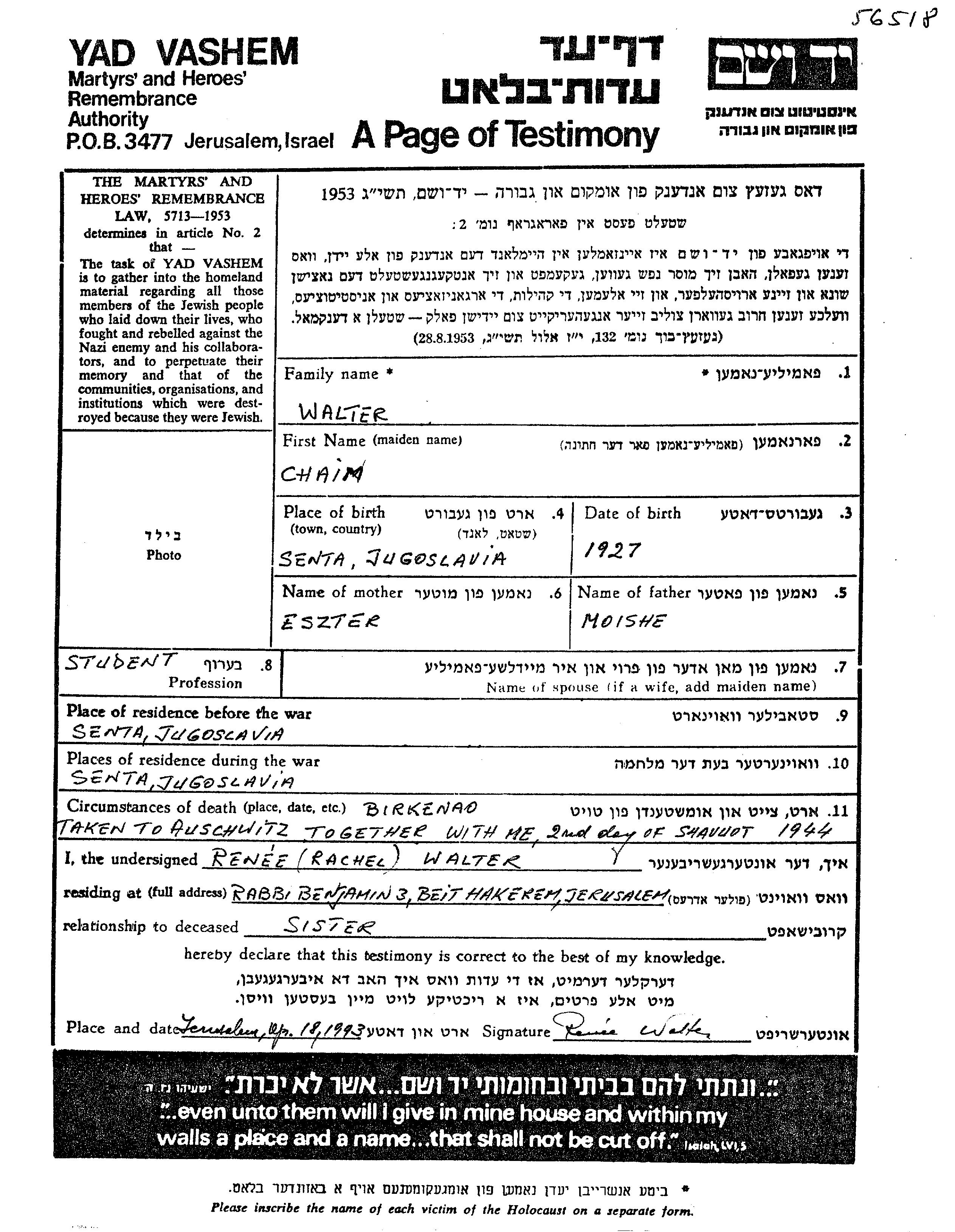 Chaim Walter wurde im Jahr 1927 in Senta, Jugoslawien geboren. Er war der Sohn von Moishe und Eszter, geb. Likhtenshtein. Er war Student und Kind. Vor dem Zweiten Weltkrieg lebte er in Senta, Jugoslawien. Während des Krieges war er in Senta, Jugoslawien.