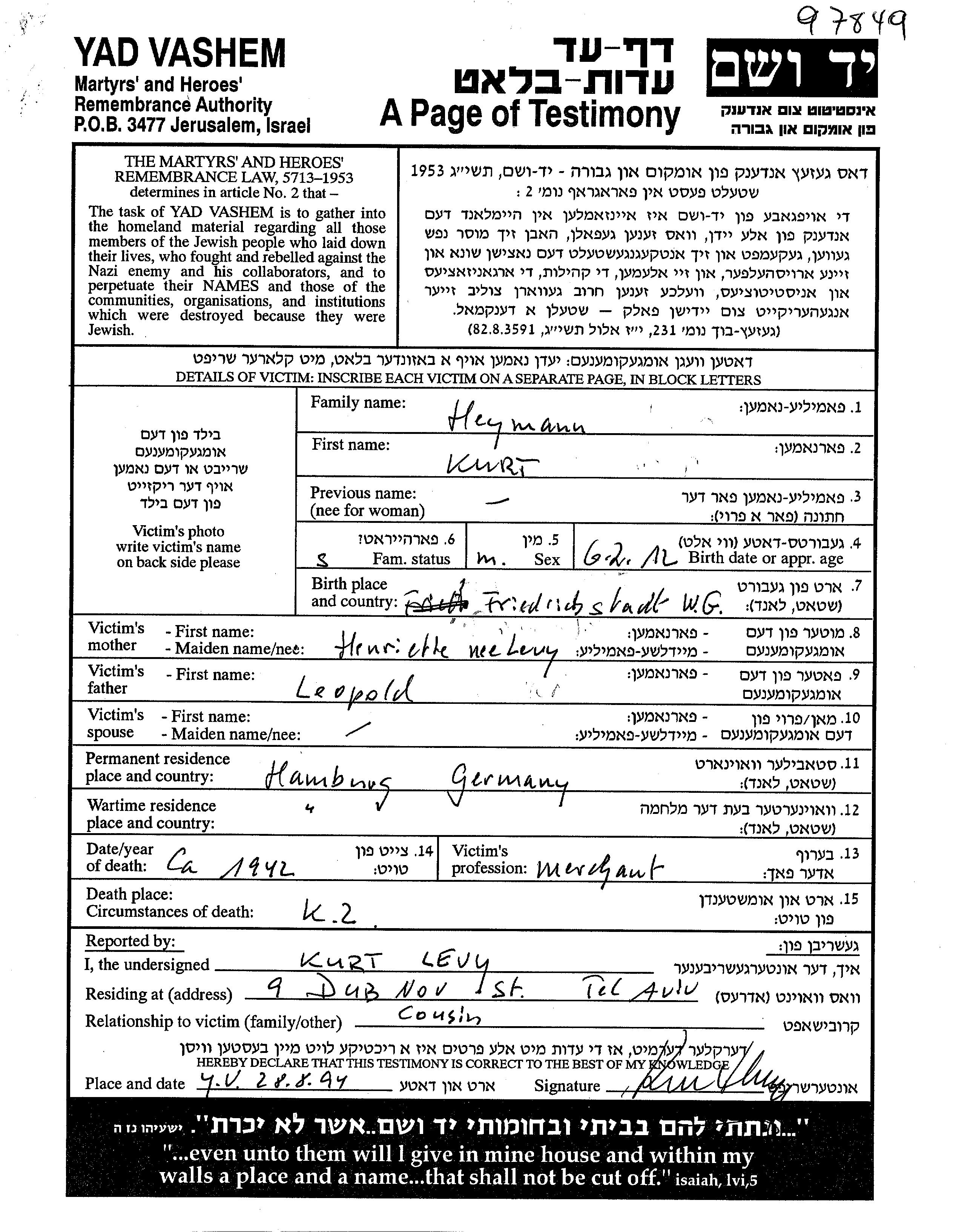 Kurt Heymann wurde im Jahr 1912 in Friedrichstadt, Deutsches Reich geboren. Er war der Sohn von Leopold und Henriette, geb. Levy. Er war Kaufmann/-frau und Ledig. Vor dem Zweiten Weltkrieg lebte er in Hamburg, Deutsches Reich. Während des Krieges war er in Hamburg, Deutsches Reich.