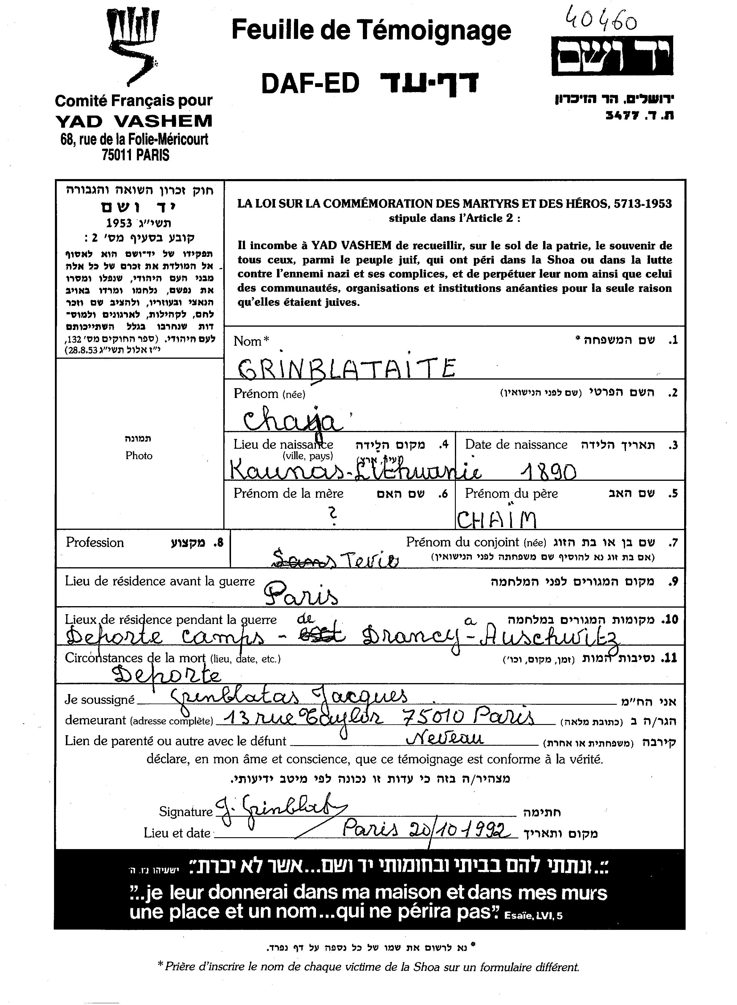 Chaja Grinblataite wurde im Jahr 1890 in Kaunas, Litauen geboren. Sie war die Tochter von Chaim. Sie war mit Tevie Verheiratet. Vor dem Zweiten Weltkrieg lebte sie in Paris, Frankreich. Während des Krieges war sie in Paris, Frankreich.