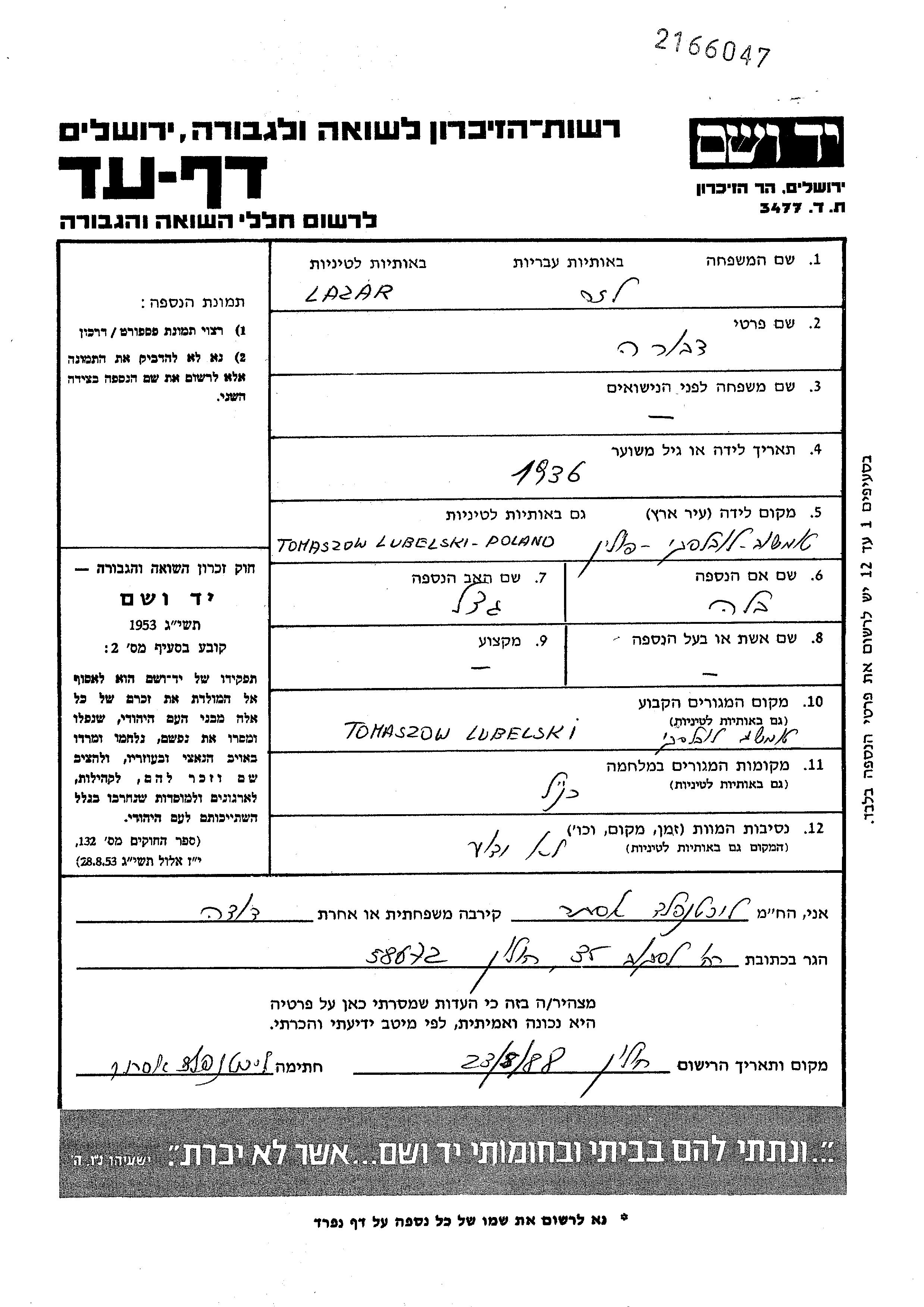 Dvora Lazar wurde im Jahr 1936 in Tomaszow, Polen geboren. Sie war die Tochter von Gedal und Bela, geb. Berger. Sie war Kind. Vor dem Zweiten Weltkrieg lebte sie in Tomaszow, Polen. Während des Krieges war sie in Tomaszow, Polen.