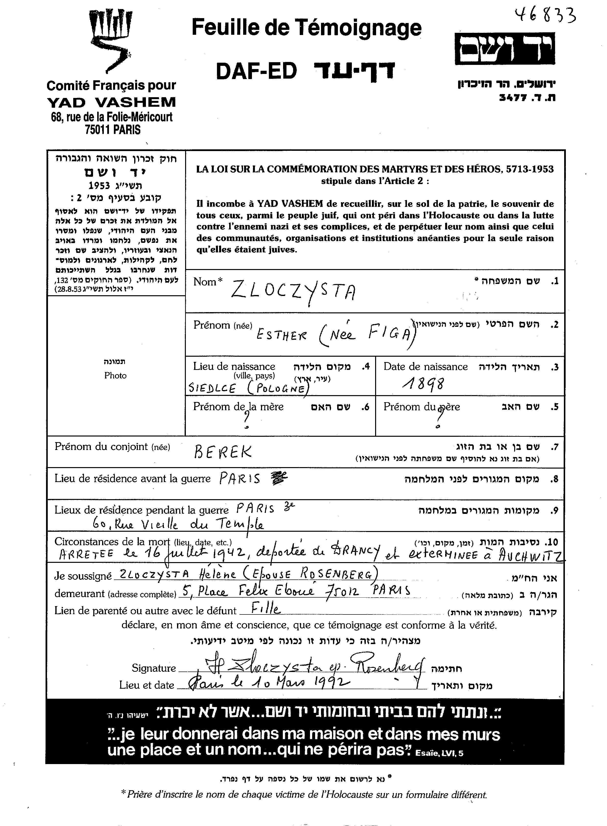 Esther Zloczysta, geb. Figa wurde im Jahr 1898 in Siedlce, Polen geboren. Sie war mit Berek Verheiratet. Vor dem Zweiten Weltkrieg lebte sie in Paris, Frankreich. Während des Krieges war sie in Paris, Frankreich.