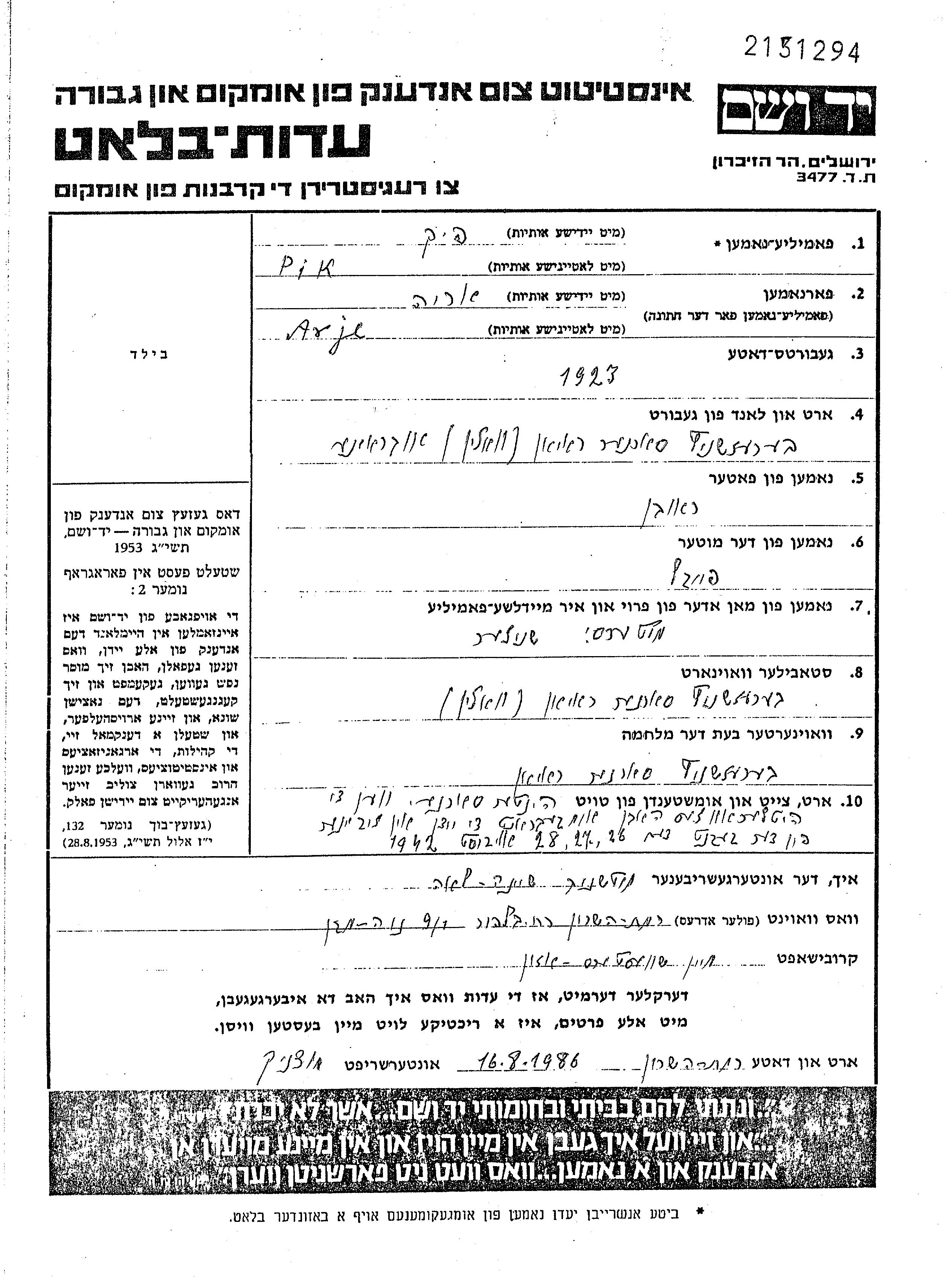 Arje Pik wurde im Jahr 1923 in Bereznica, Polen geboren. Er war der Sohn von Ruwen und Fejgl, geb. Shnitzer. Er war Ledig. Vor dem Zweiten Weltkrieg lebte er in Bereznica, Polen. Während des Krieges war er in Bereznica, Polen.