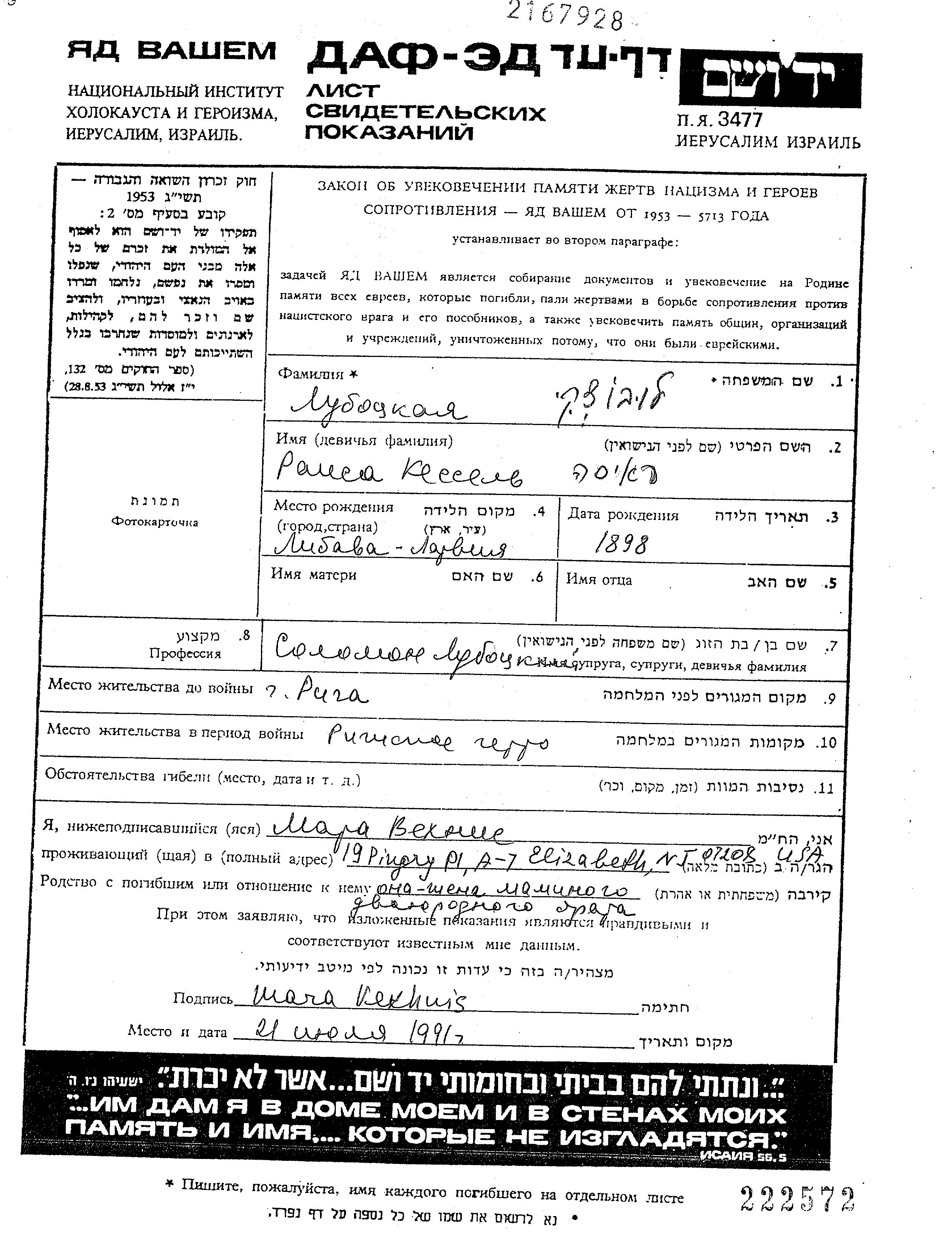 Raisa Lubotzki, geb. Kesel wurde im Jahr 1898 in Libava, Lettland geboren. Sie war mit Solomon Verheiratet. Vor dem Zweiten Weltkrieg lebte sie in Riga, Lettland. Während des Krieges war sie in Riga, Lettland.