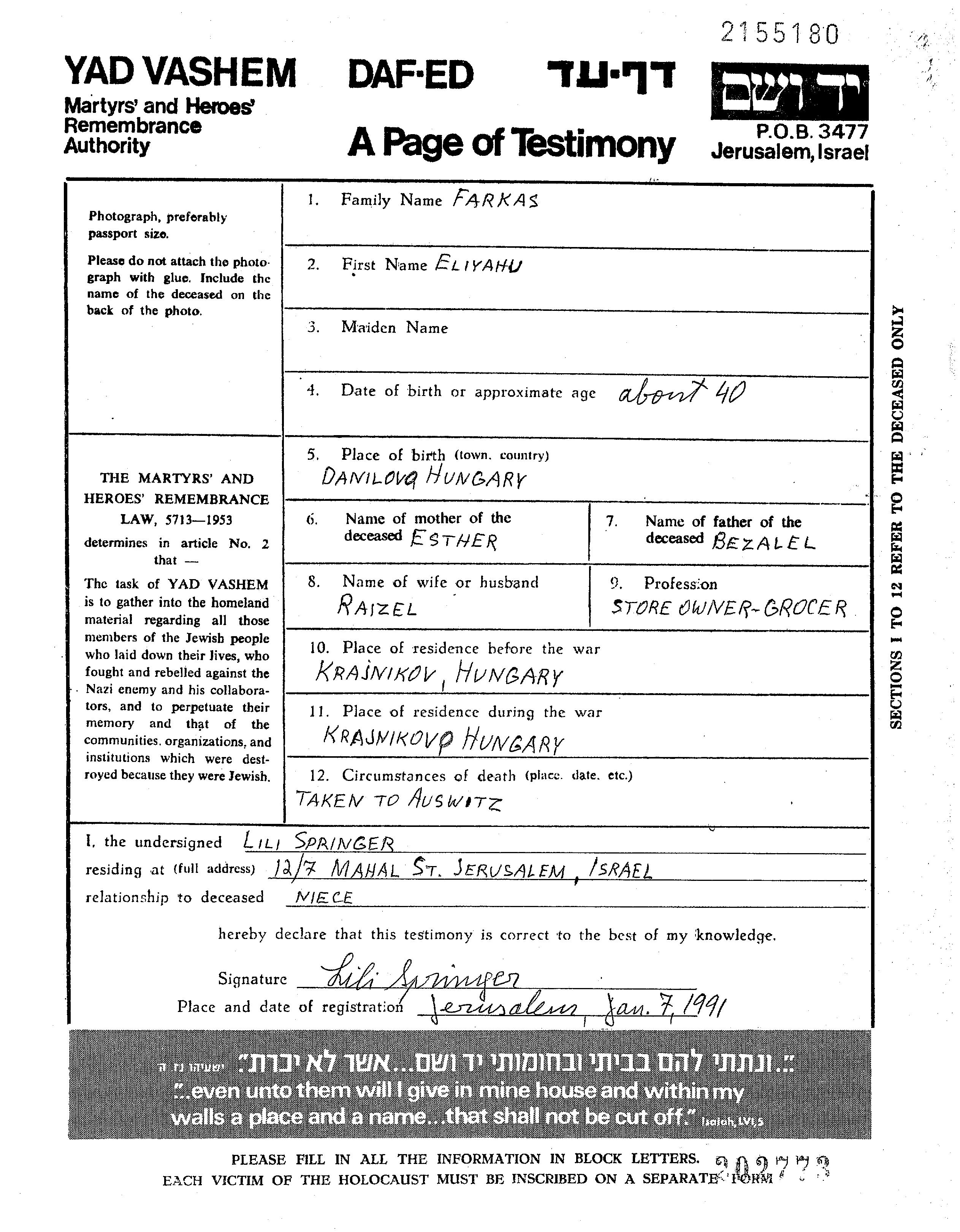 Eliyahu Farkas wurde in Danilovo, Tschechoslowakei geboren. Er war der Sohn von Bezalel und Esther. Er war Besitzer/-in eines lebensmittelgeschäfts und mit Raizel Verheiratet. Vor dem Zweiten Weltkrieg lebte er in Krajnikovo, Tschechoslowakei. Während des Krieges war er in Krajnikovo, Tschechoslowakei.
