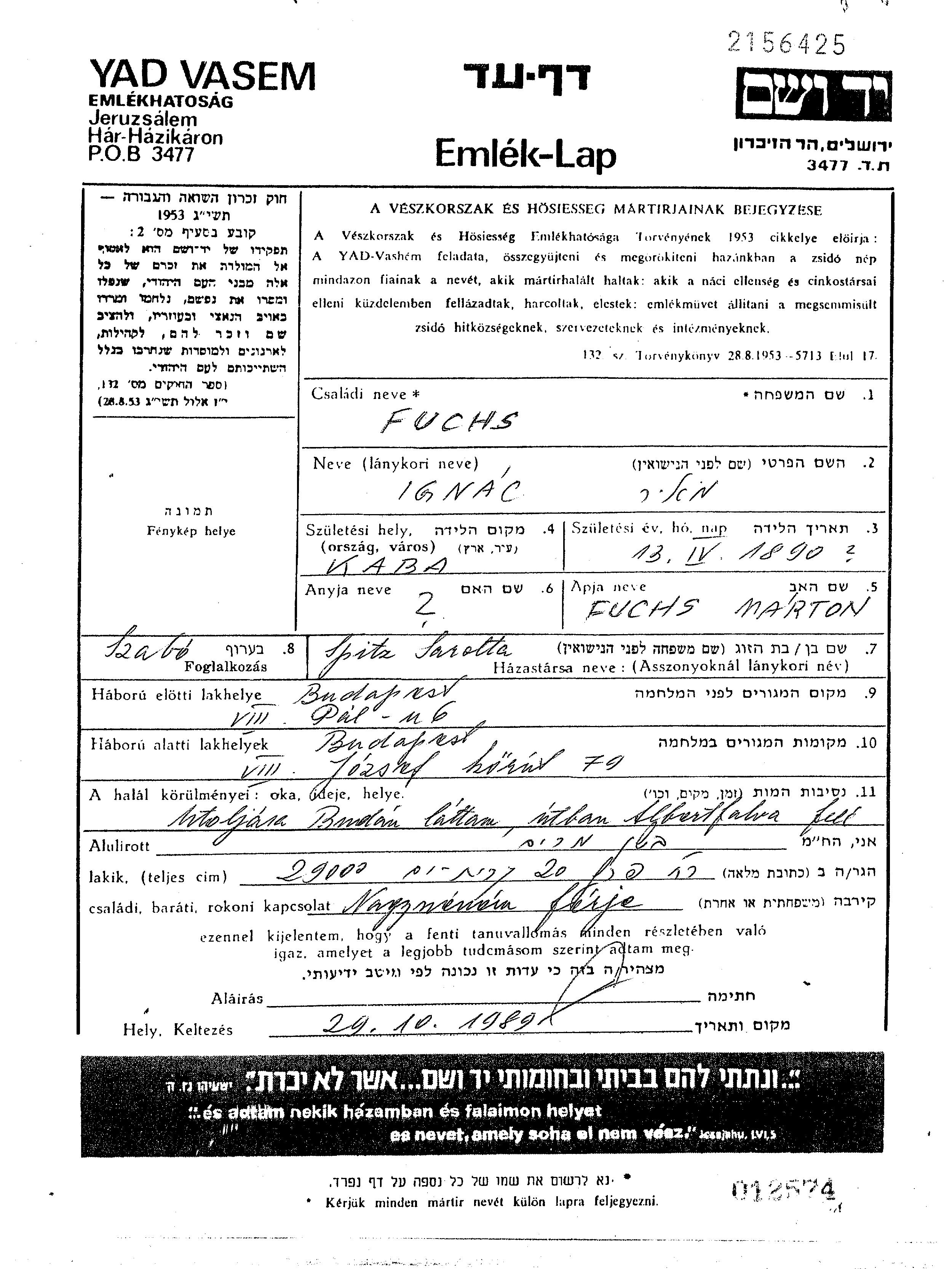 Ignac Meir Fuchs wurde im Jahr 1890 in Kaba, Ungarn geboren. Er war der Sohn von Marton. Er war Schneider und mit Sarolta Verheiratet. Vor dem Zweiten Weltkrieg lebte er in Budapest, Ungarn. Während des Krieges war er in Budapest, Ungarn.