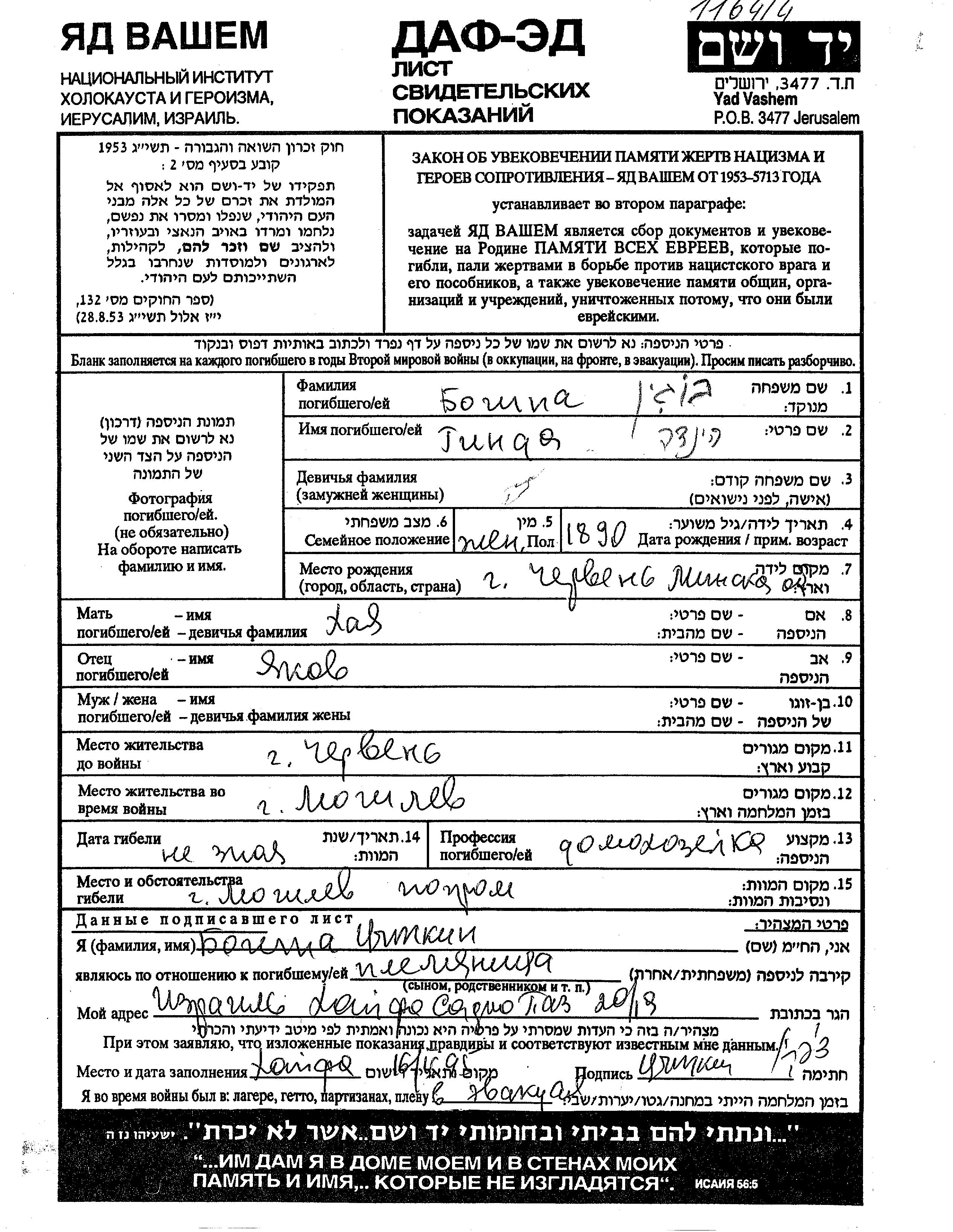Khinda Bogin wurde im Jahr 1890 in Cherven, Weißrussland (UdSSR) geboren. Sie war die Tochter von Yankel und Khaia. Sie war Hausfrau. Vor dem Zweiten Weltkrieg lebte sie in Mogilev, Weißrussland (UdSSR).