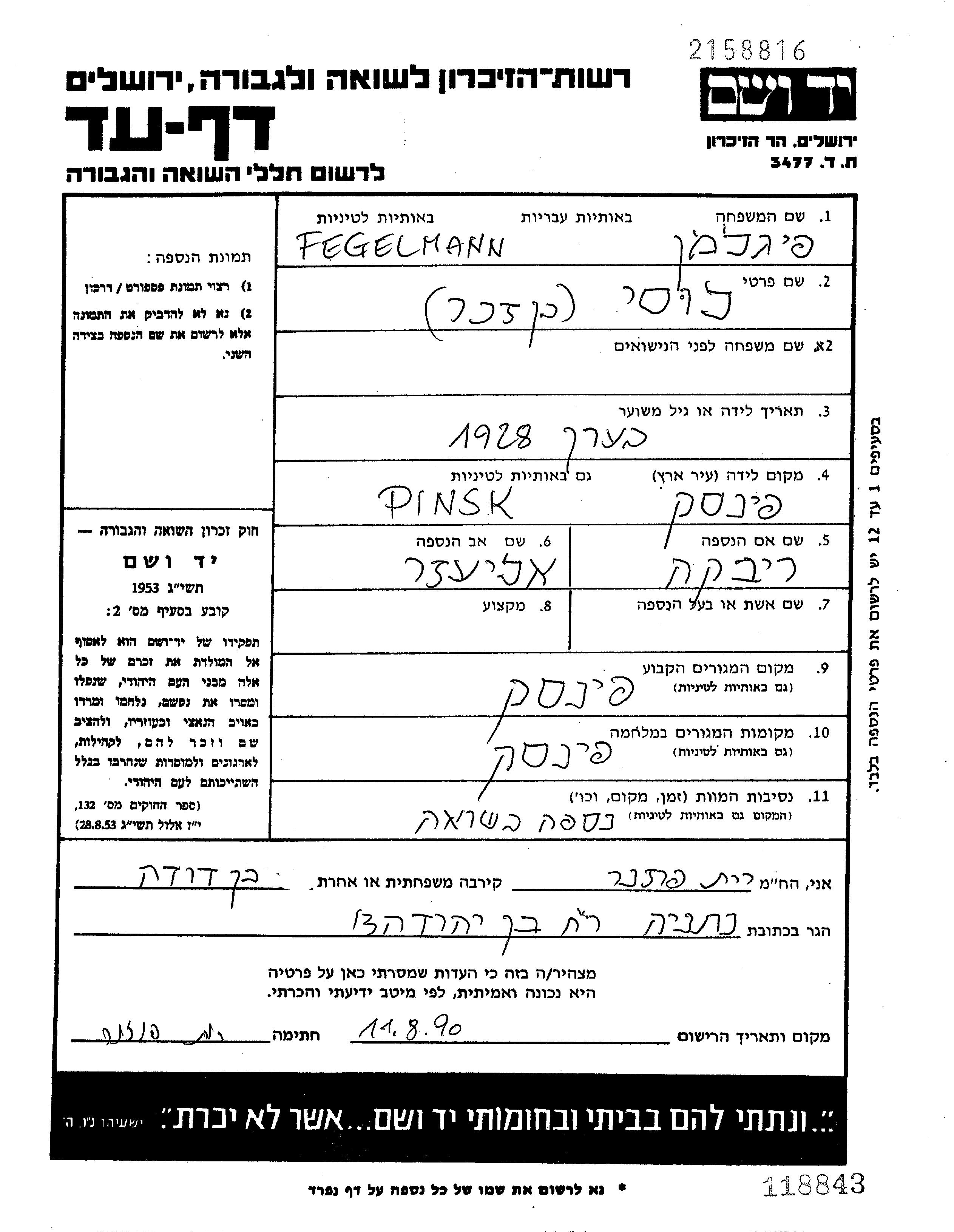 Lusi Fegelmann Feigelman wurde im Jahr 1928 in Pinsk, Polen geboren. Sie war die Tochter von Eliezer und Rivka, geb. Rozhanski. Sie war Kind. Vor dem Zweiten Weltkrieg lebte sie in Pinsk, Polen. Während des Krieges war sie in Pinsk, Polen.