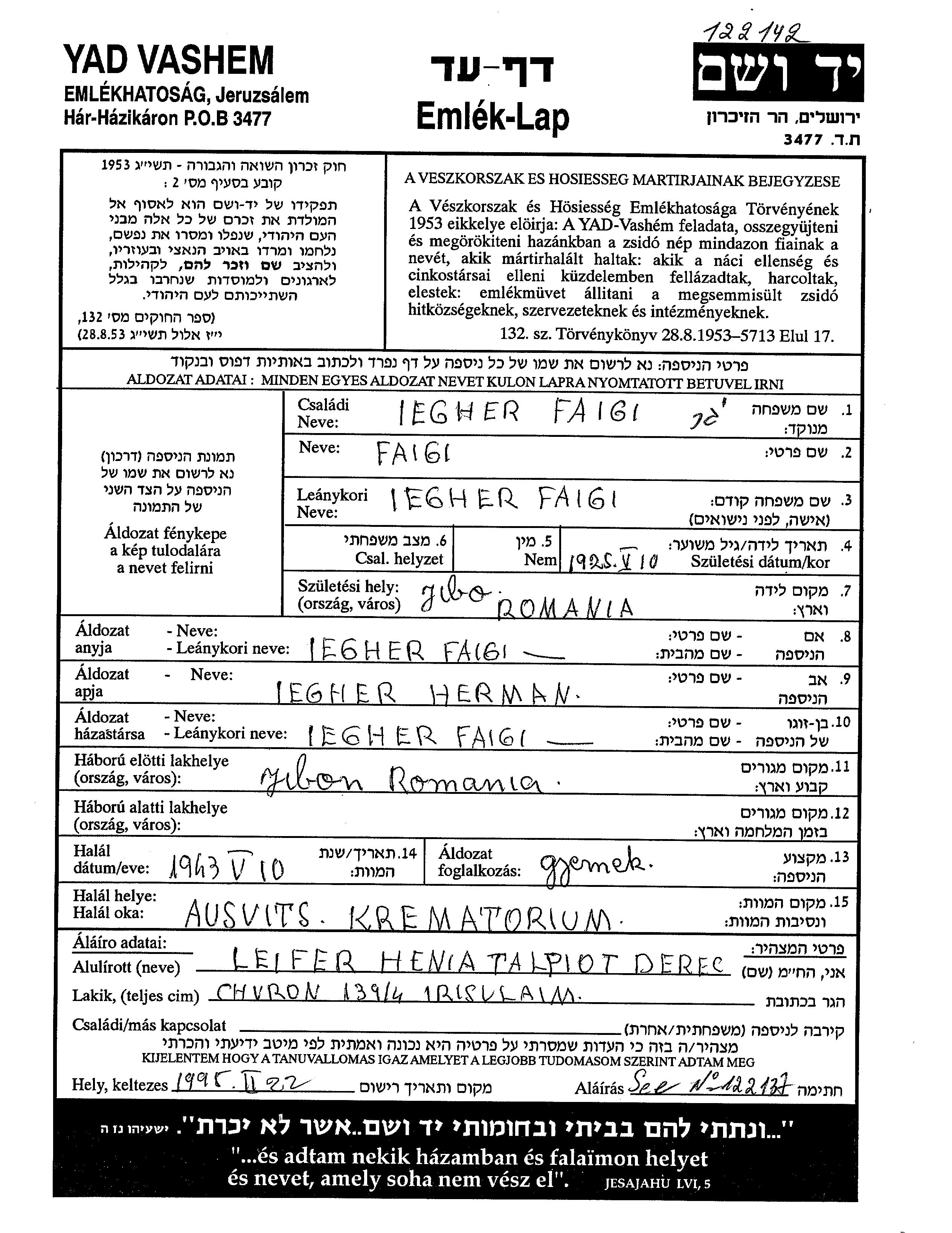 Faigi Iegher wurde im Jahr 1925 in Jibou, Rumänien geboren. Sie war die Tochter von Herman. Sie war Kaufmann/-frau. Vor dem Zweiten Weltkrieg lebte sie in Jibou, Rumänien. Während des Krieges war sie in Jibou, Rumänien.