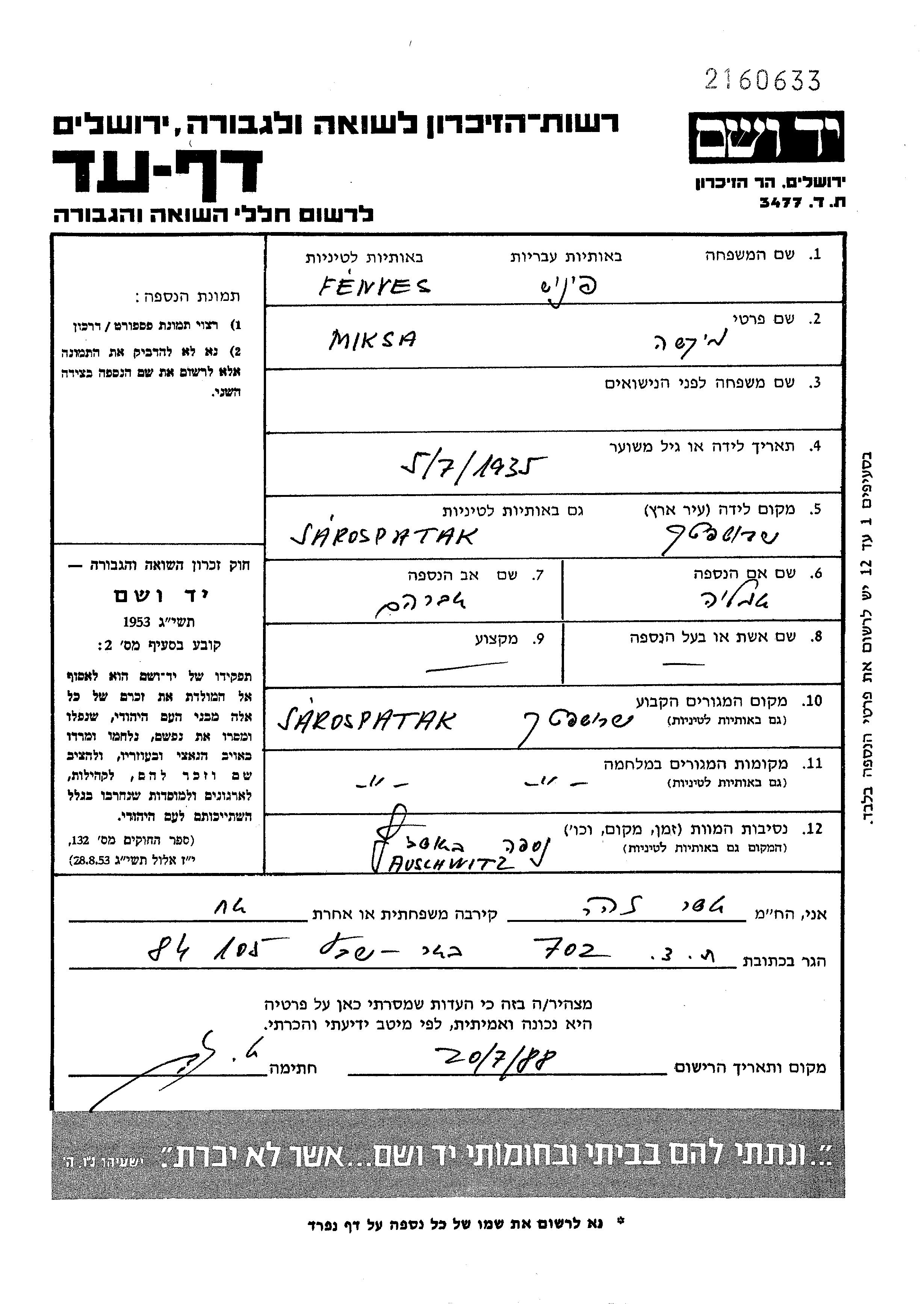 Miksa wurde in der Schoah ermordet. Todesort: Auschwitz, Polen.