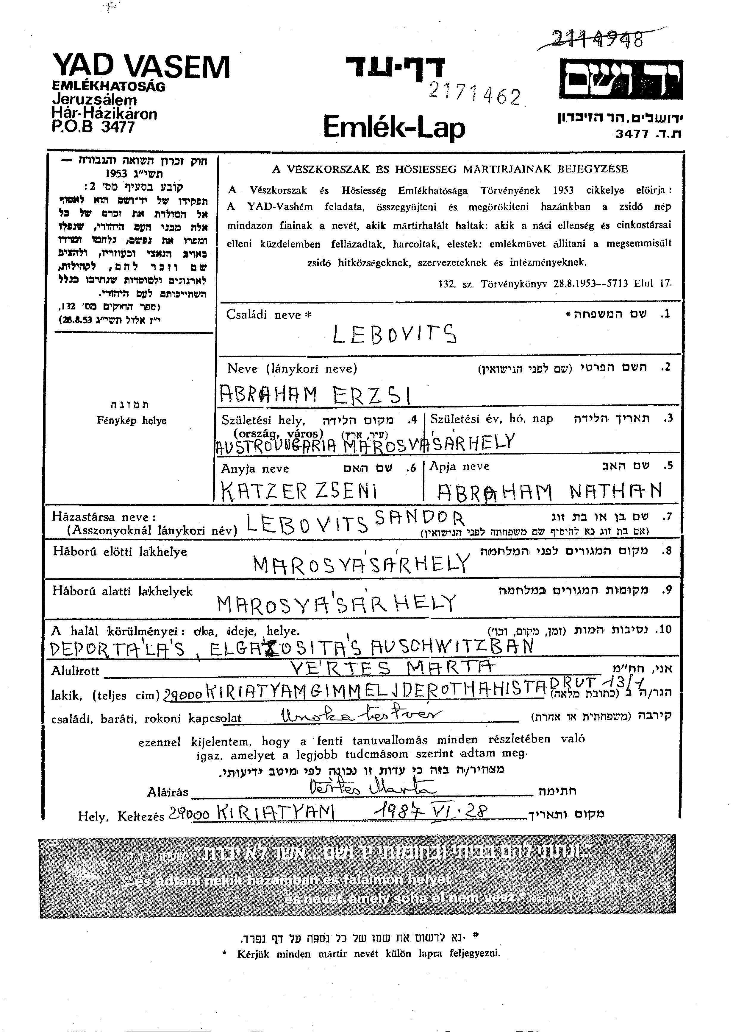 Erzsi Lebovits, geb. Abraham wurde in Marosvasarhely, Rumänien geboren. Sie war die Tochter von Nathan und Zseni, geb. Katzer. Sie war mit Sandor Verheiratet. Vor dem Zweiten Weltkrieg lebte sie in Marosvasarhely, Rumänien. Während des Krieges war sie in Marosvasarhely, Rumänien.