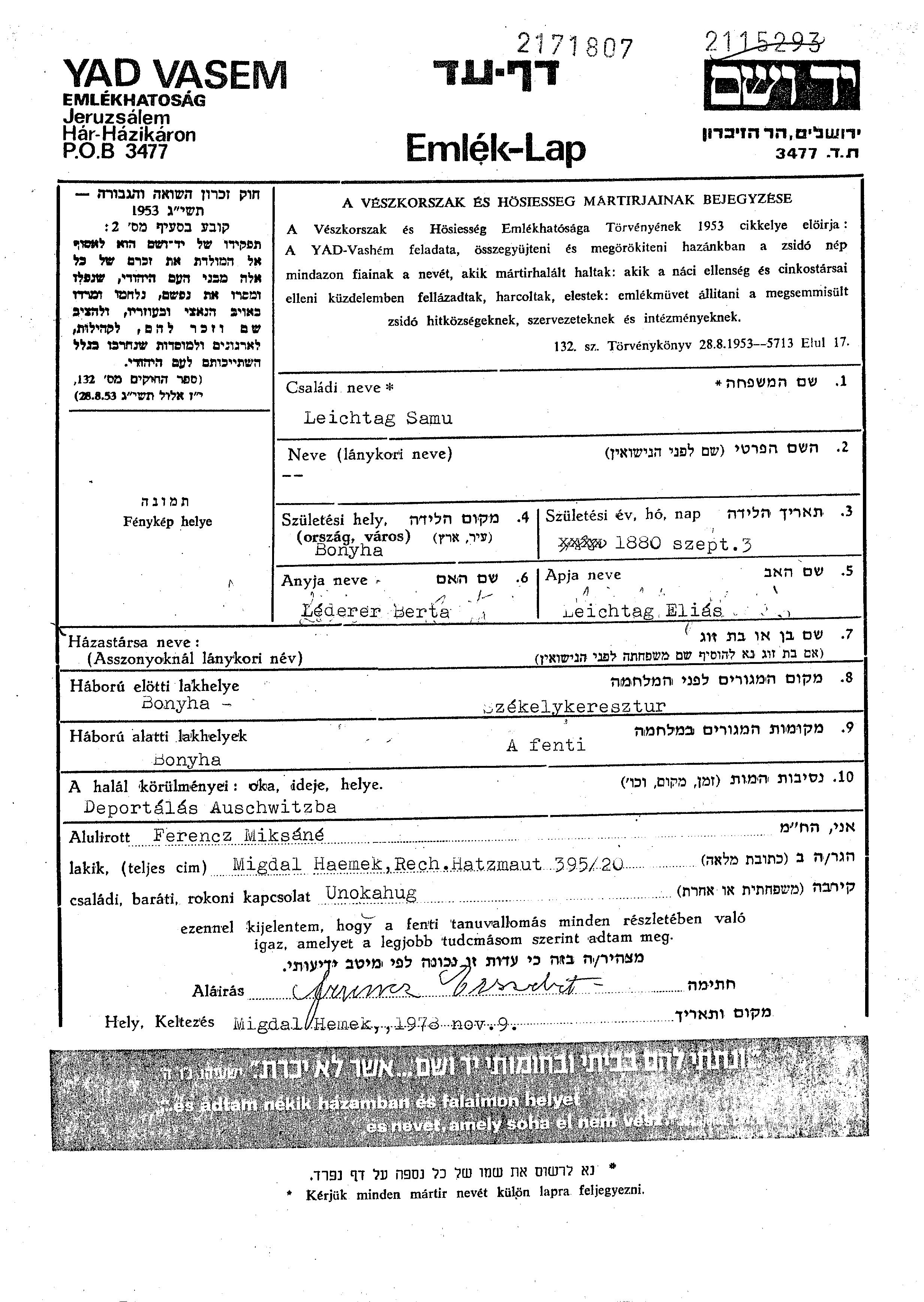 Samu Leichtag wurde im Jahr 1880 in Bonyhad, Ungarn geboren. Er war der Sohn von Elias und Berta, geb. Lederer. Er war Verheiratet. Vor dem Zweiten Weltkrieg lebte er in Bonyhad, Ungarn. Während des Krieges war er in Bonyhad, Ungarn.
