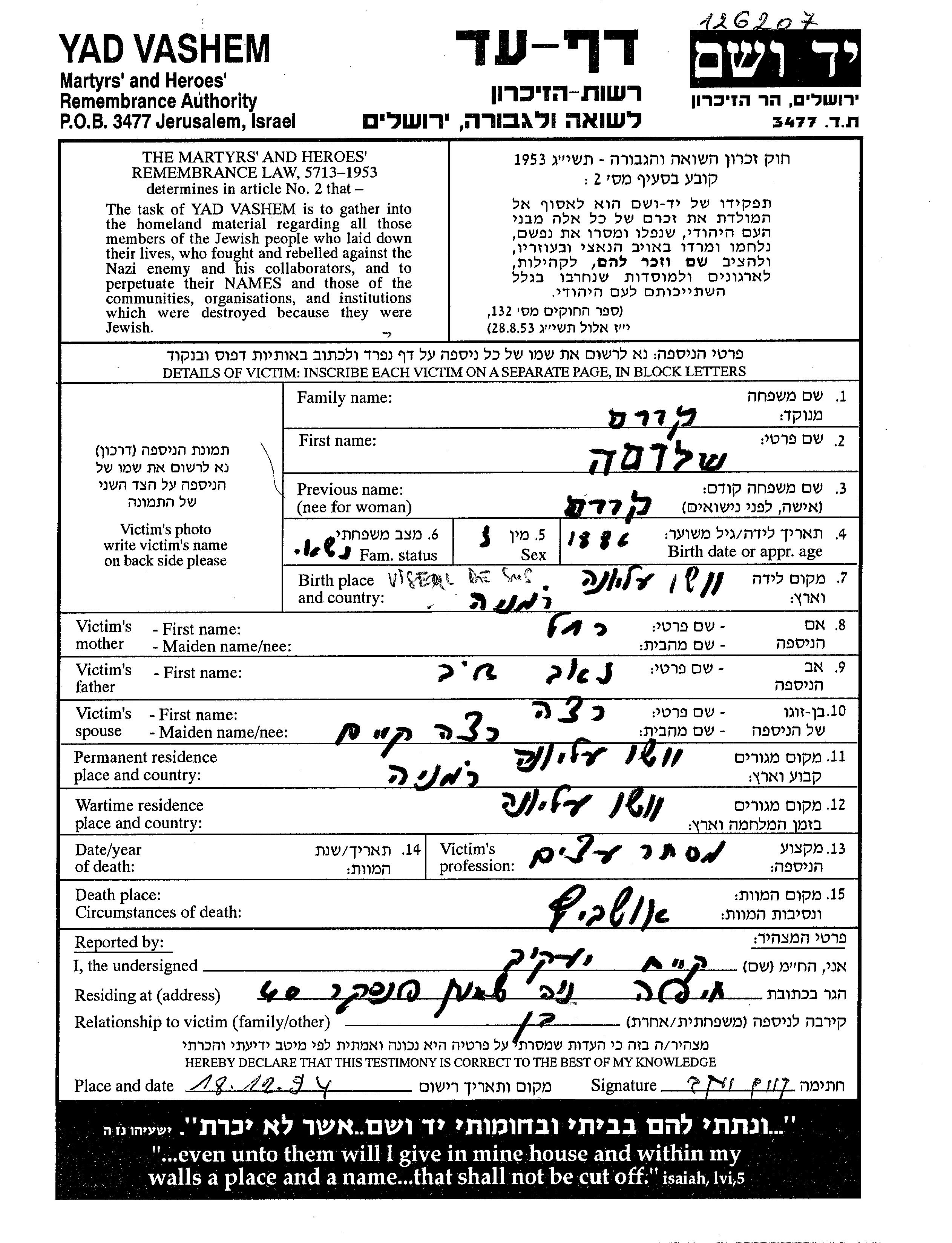 Shlomo wurde in der Schoah ermordet. Todesort: Auschwitz, Polen.