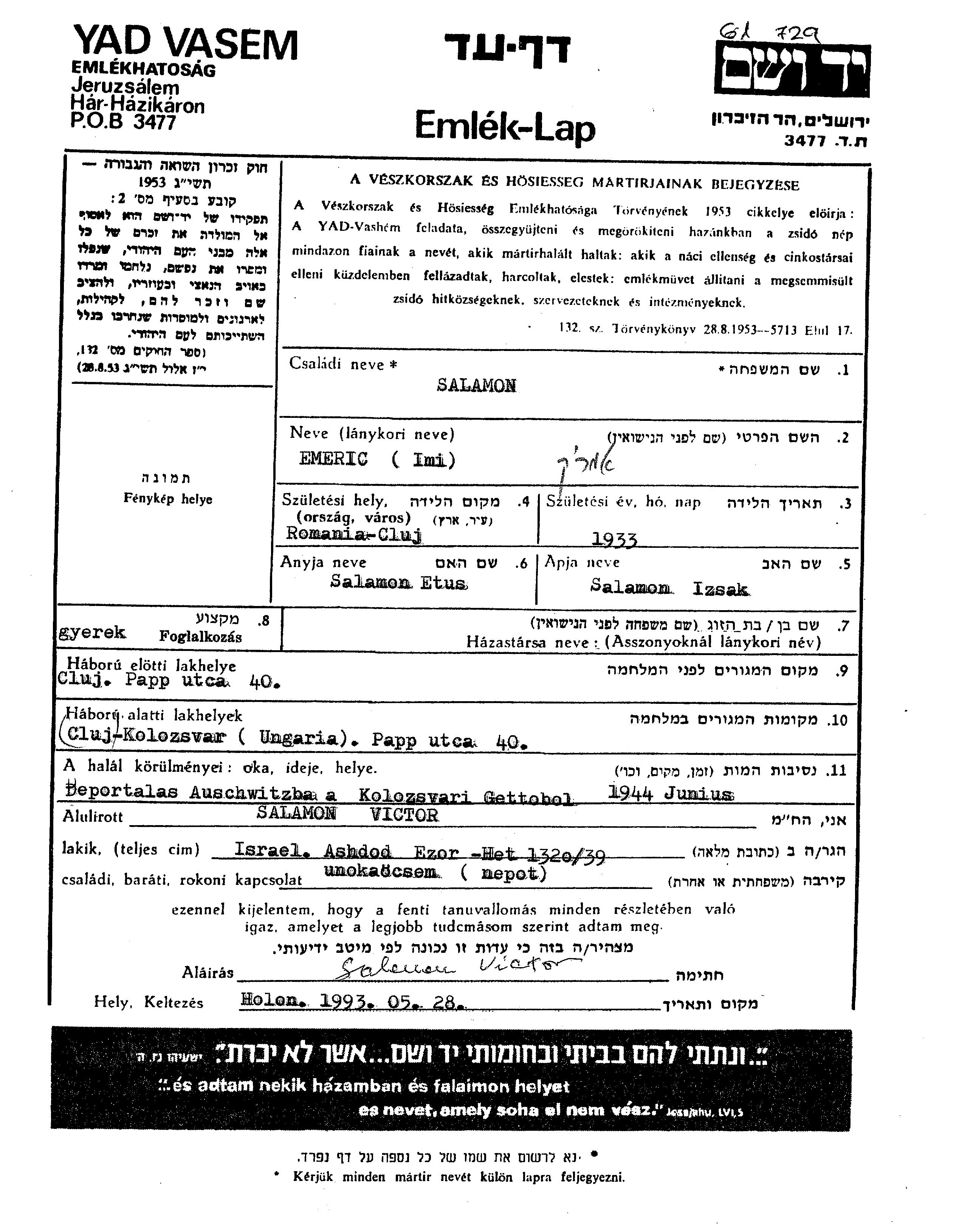 Emeric Imi Salamon Shalamon wurde im Jahr 1933 in Kolozsvar, Rumänien geboren. Er war der Sohn von Izsak und Etus. Er war Kind. Vor dem Zweiten Weltkrieg lebte er in Kolozsvar, Rumänien. Während des Krieges war er in Kolozsvar, Rumänien.