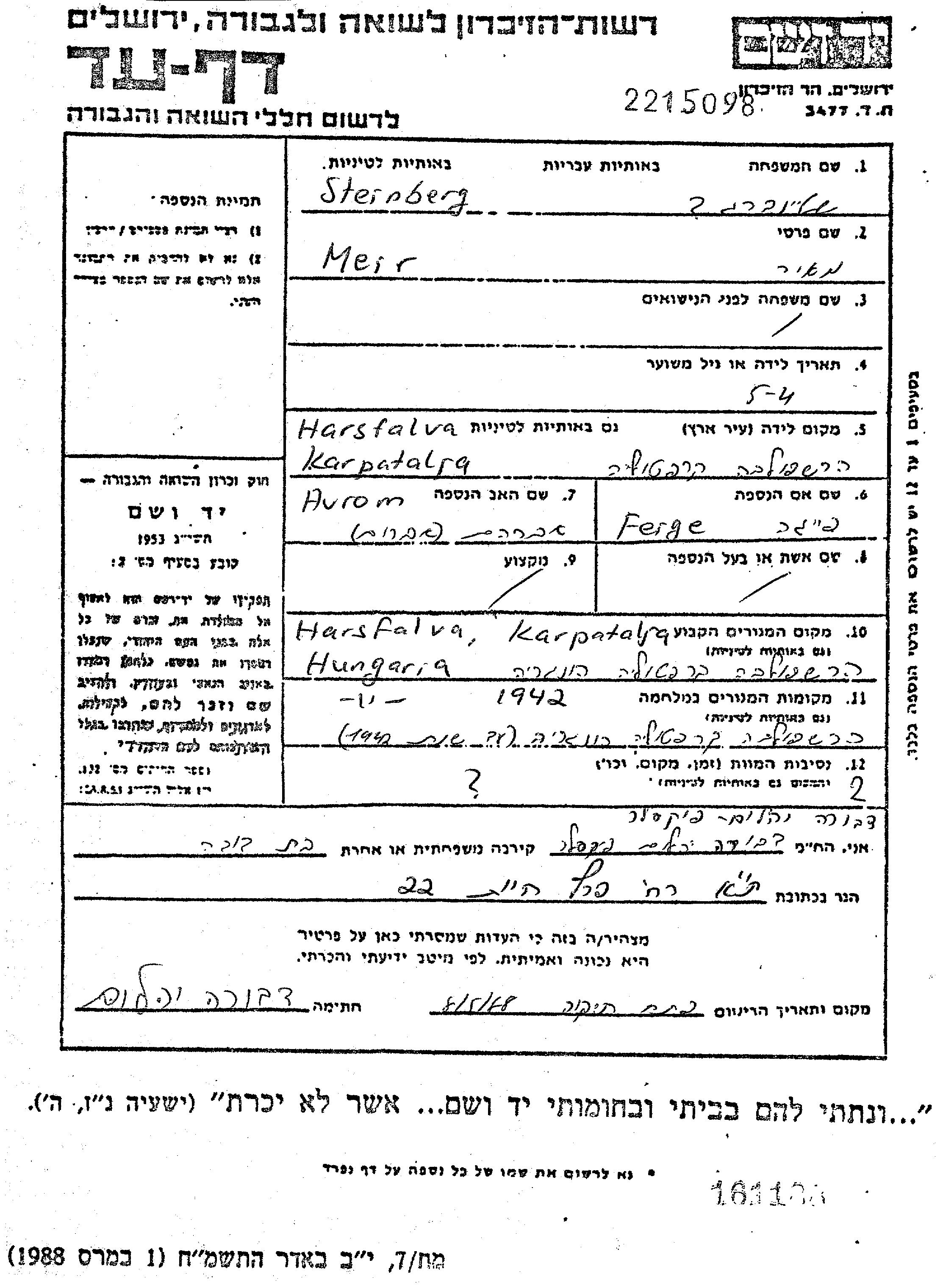 Meir Steinberg wurde in Harsfalva, Tschechoslowakei geboren. Er war der Sohn von Avraham und Feiga, geb. Fixler. Er war Kind. Vor dem Zweiten Weltkrieg lebte er in Harsfalva, Tschechoslowakei. Während des Krieges war er in Harsfalva, Tschechoslowakei.