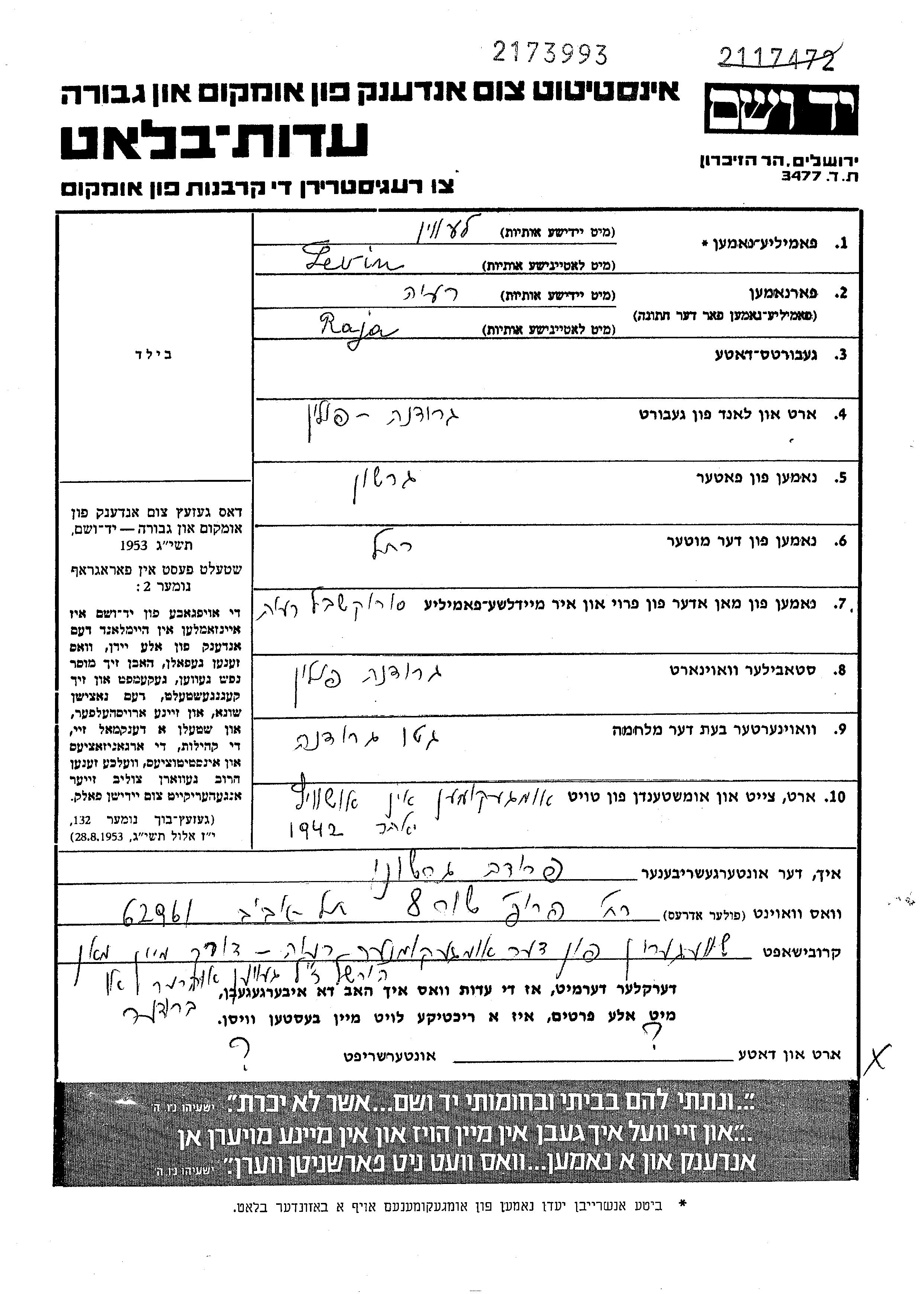Raja Levin, geb. Sorokshabel wurde in Grodno, Polen geboren. Sie war die Tochter von Gershon und Rakhel. Vor dem Zweiten Weltkrieg lebte sie in Grodno, Polen. Während des Krieges war sie in Grodno, Polen.