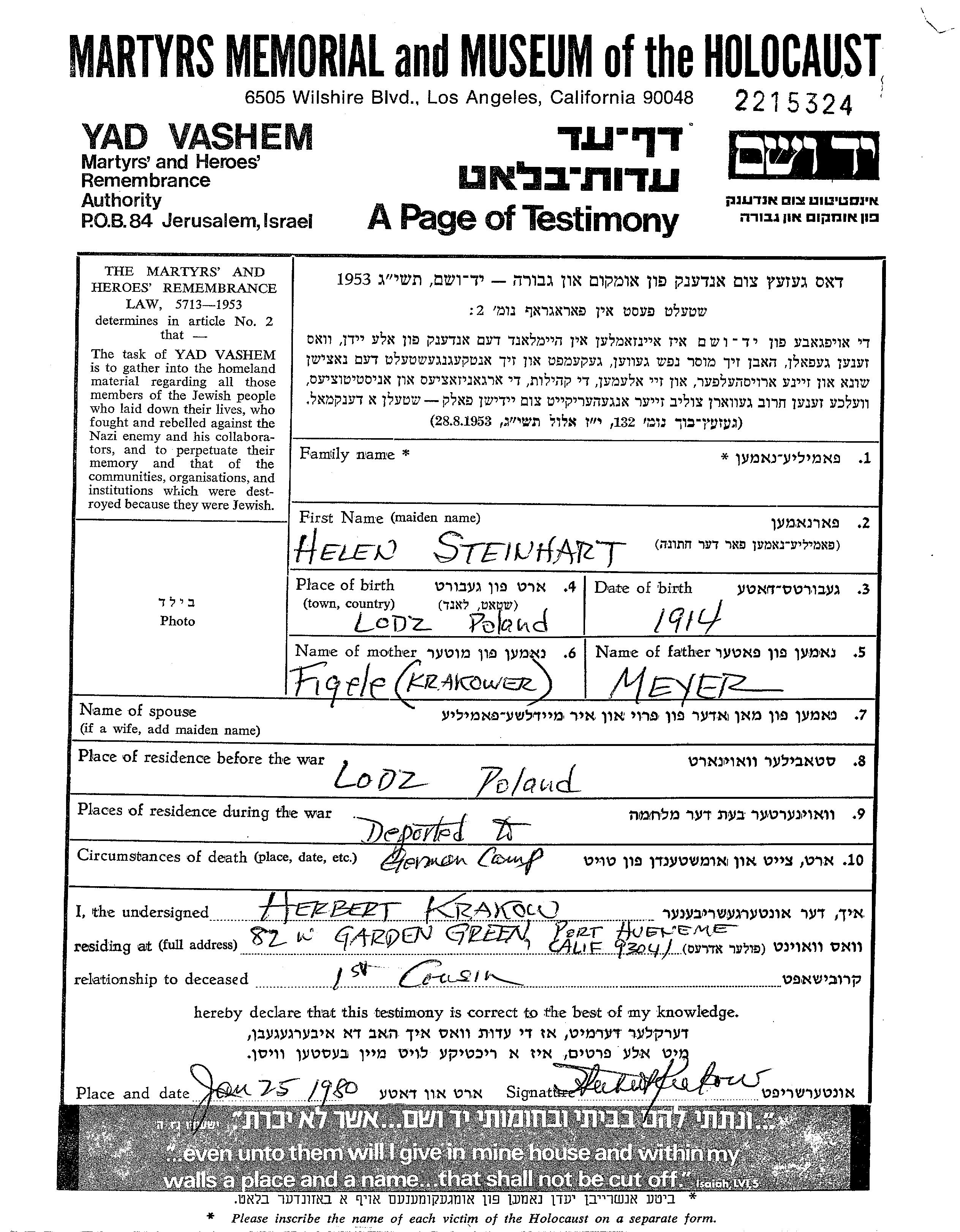 Helen Steinhart wurde im Jahr 1914 in Lodz, Polen geboren. Sie war die Tochter von Meyer und Figele, geb. Krakower. Vor dem Zweiten Weltkrieg lebte sie in Lodz, Polen. Während des Krieges war sie in Lodz, Polen.