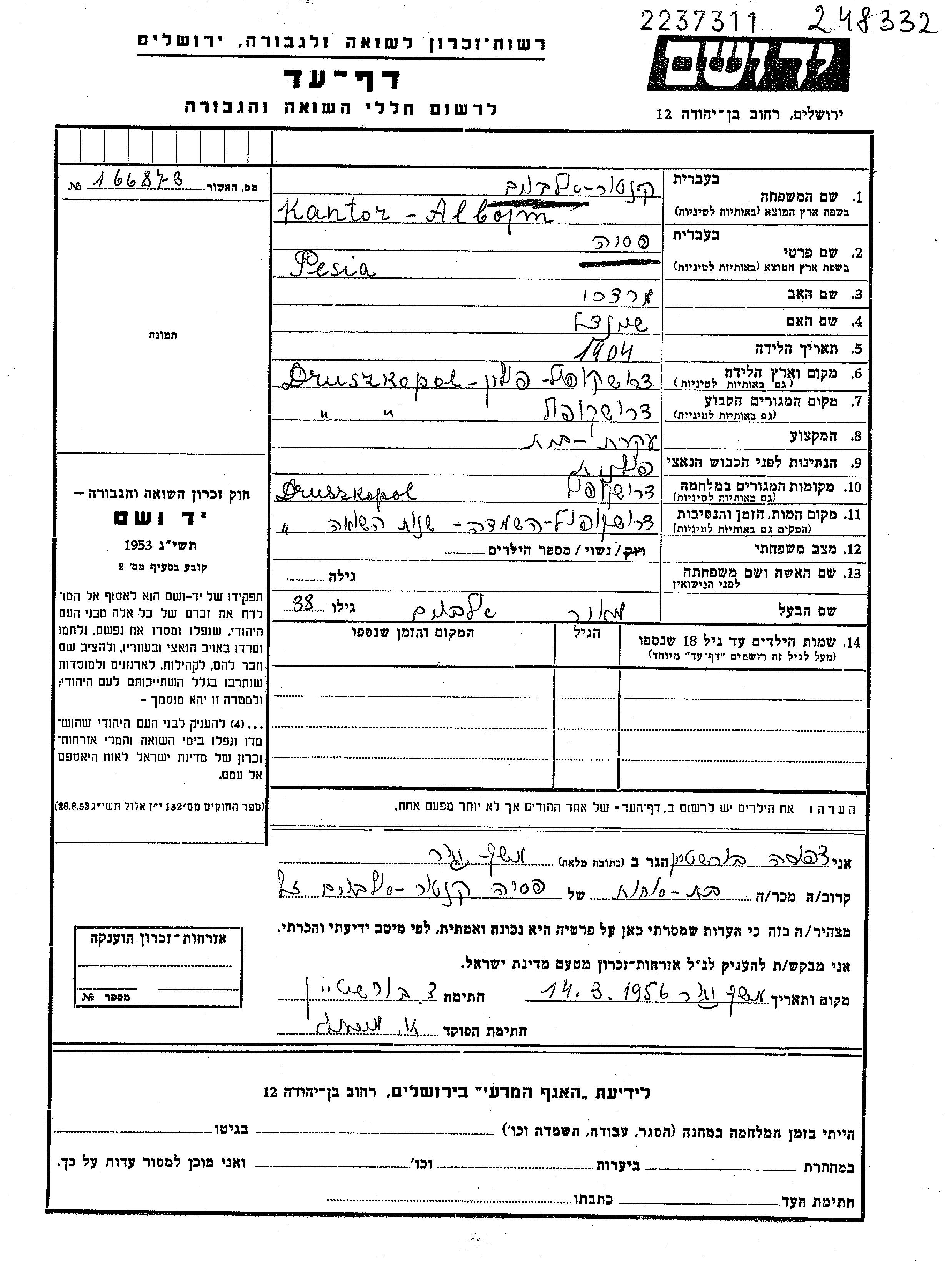 Pesia Albojm, geb. Kantor wurde im Jahr 1904 in Druszkopol, Polen geboren. Sie war die Tochter von Mordehai und Sheindl. Sie war Hausfrau und mit Meir Verheiratet. Vor dem Zweiten Weltkrieg lebte sie in Druszkopol, Polen. Während des Krieges war sie in Druszkopol, Polen.