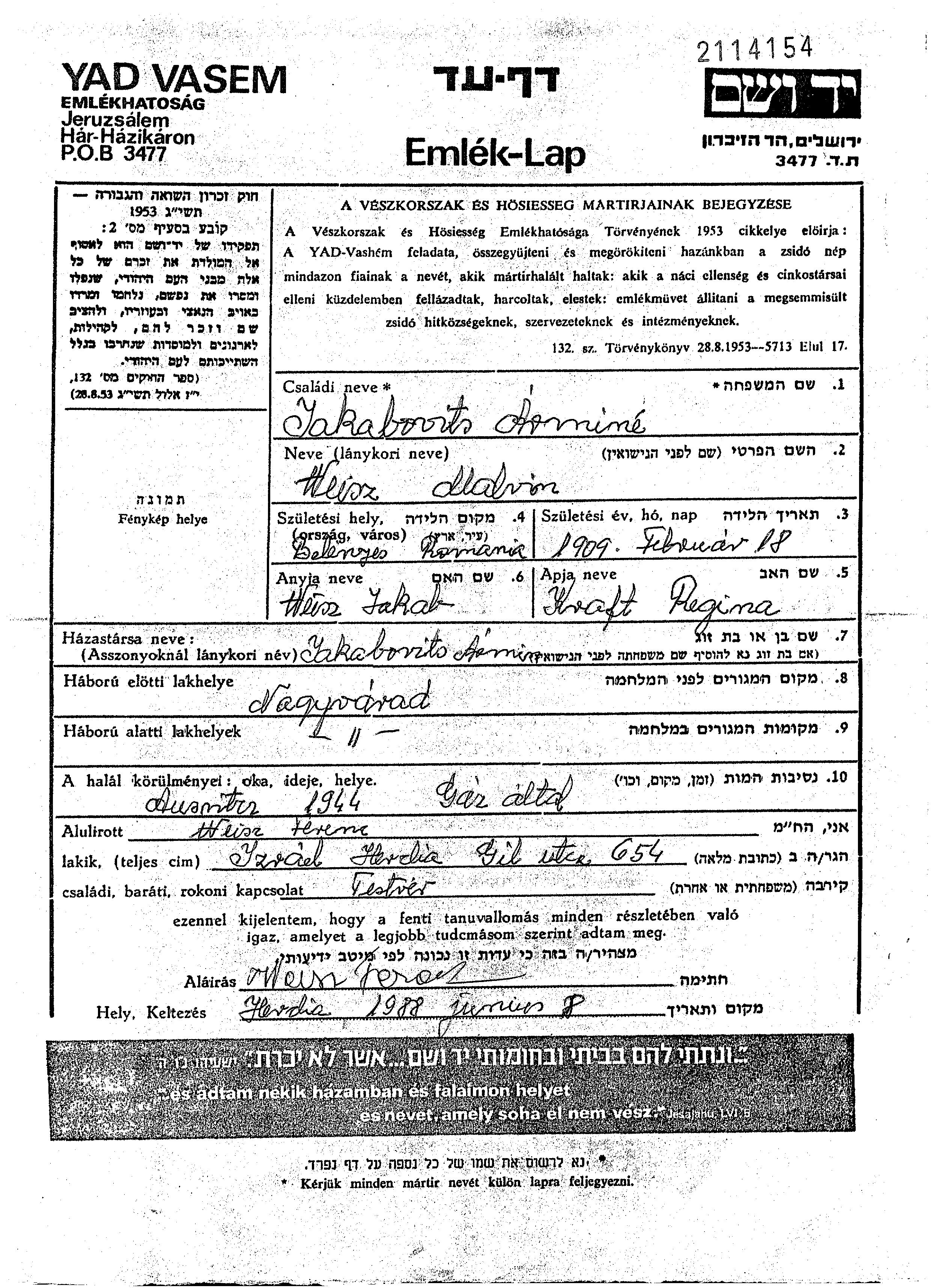 Malvina Malvin Jakabovits, geb. Weisz wurde im Jahr 1909 in Belenyes, Rumänien geboren. Sie war die Tochter von Jakab und Regina, geb. Kraft. Sie war mit Armin Verheiratet. Vor dem Zweiten Weltkrieg lebte sie in Nagyvarad, Rumänien. Während des Krieges war sie in Nagyvarad, Rumänien.