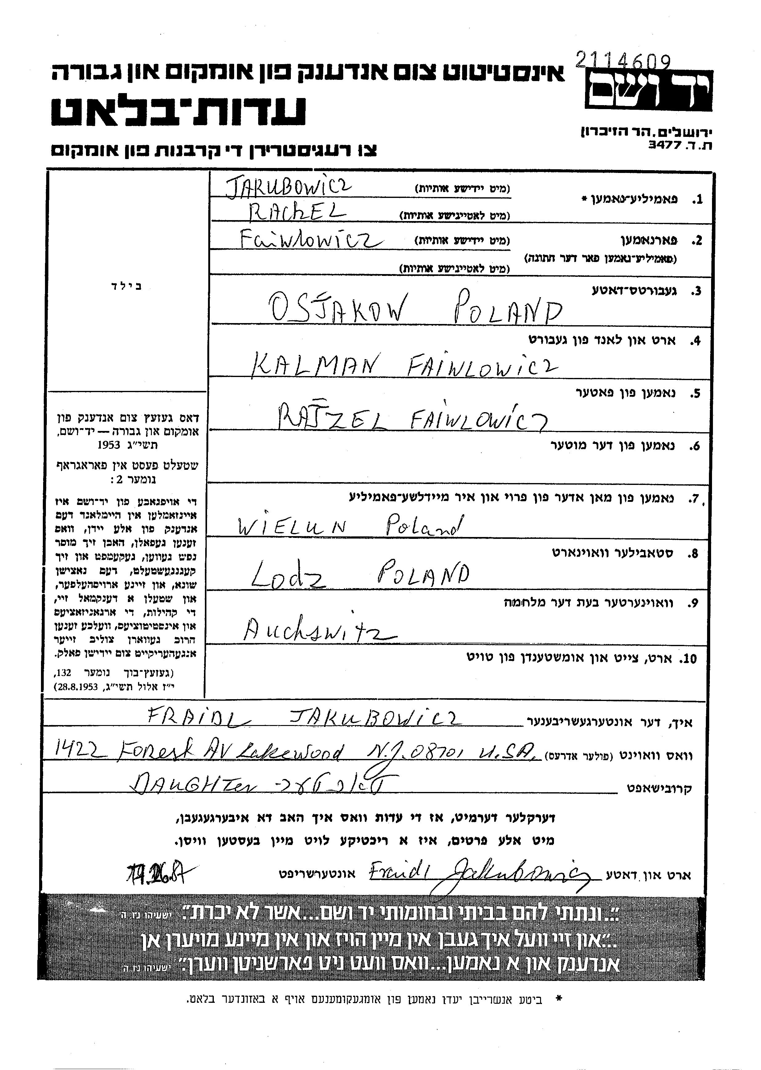 Jakubowicz Rachel Wielun, Polen Gedenkblatt