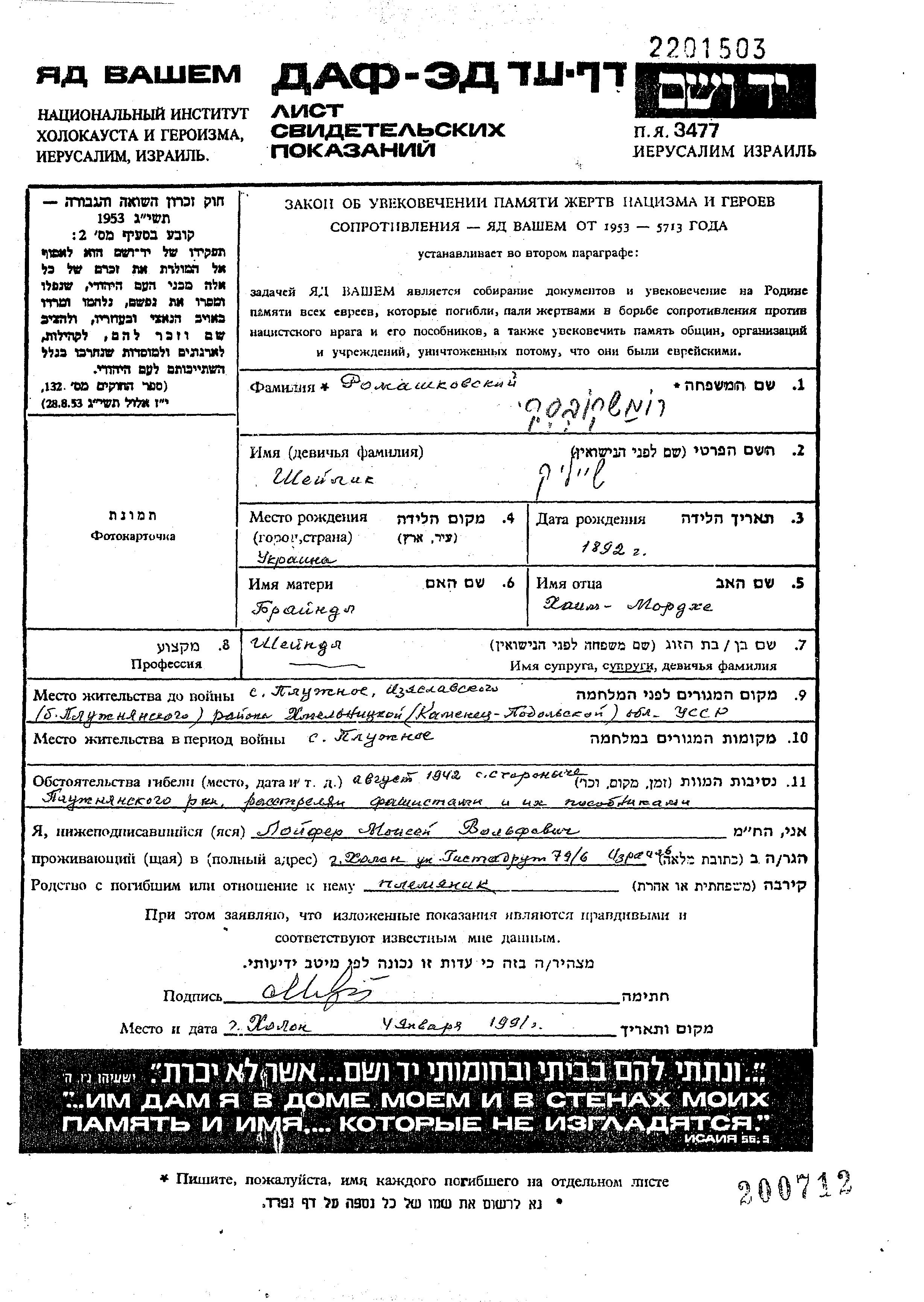 Sheilik Romashkovski wurde im Jahr 1892 in Ukraine (UdSSR) geboren. Er war der Sohn von Haim Mordkhe und Braindl. Er war mit Sheindl Verheiratet. Vor dem Zweiten Weltkrieg lebte er in Plyushchevka, Ukraine (UdSSR). Während des Krieges war er in Plyushchevka, Ukraine (UdSSR).