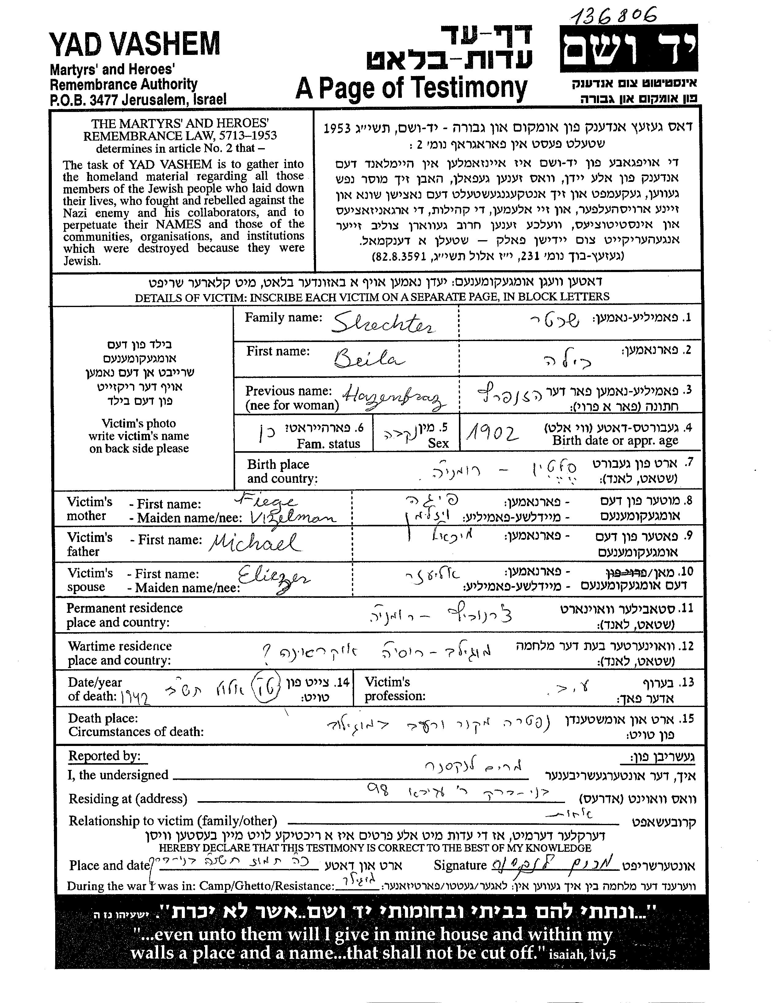 Beila Shechter, geb. Hazenfratz wurde im Jahr 1902 in Seletin, Rumänien geboren. Sie war die Tochter von Michael und Fiege, geb. Vizelman. Sie war Hausfrau und mit Eliezer Verheiratet. Vor dem Zweiten Weltkrieg lebte sie in Czernowitz, Rumänien. Während des Krieges war sie in Mogilev Podolski, Ukraine (UdSSR).