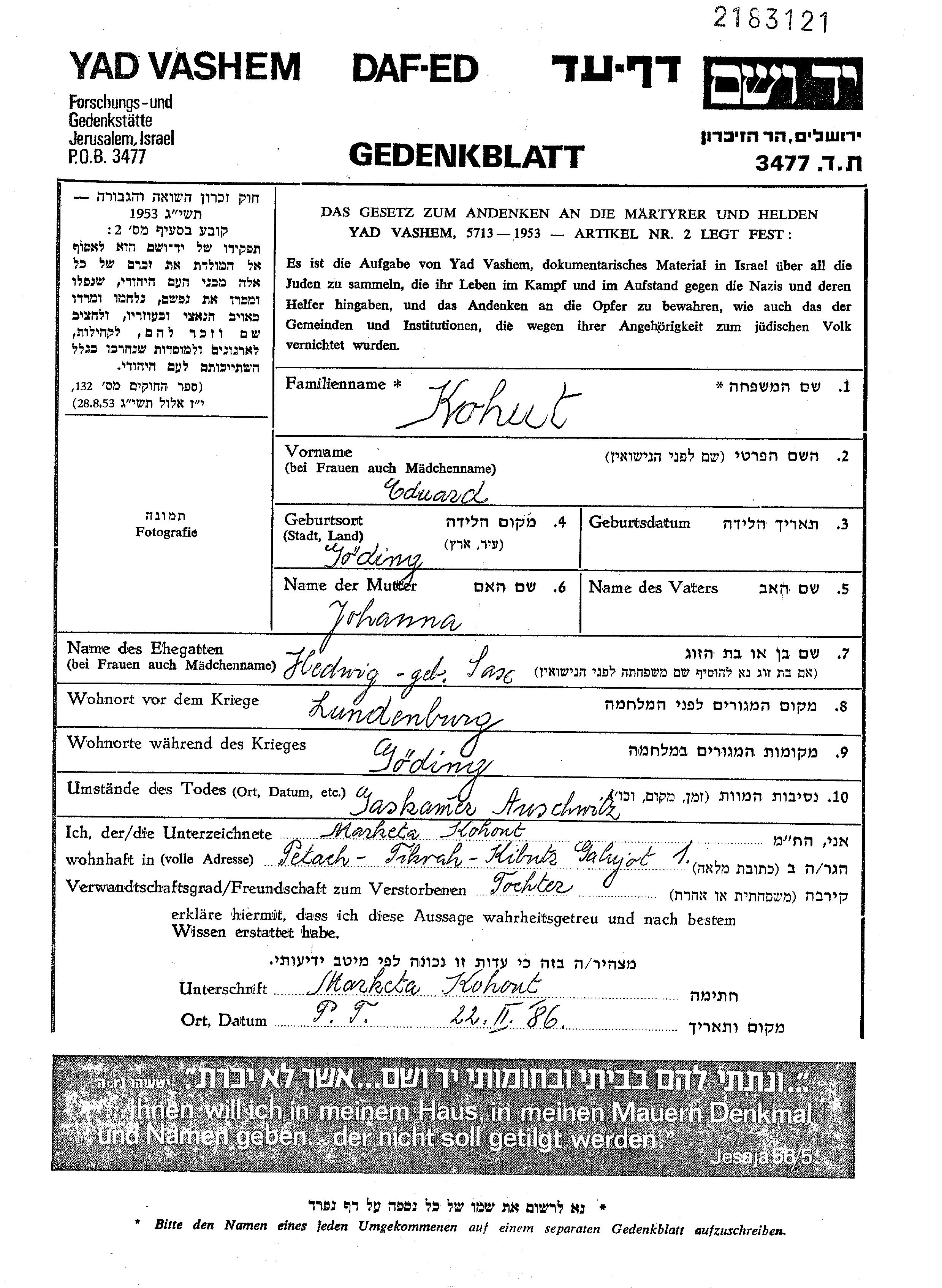 Eduard Kohut wurde in Goeding, Tschechoslowakei geboren. Er war der Sohn von Johanna. Er war mit Hedwig Verheiratet. Vor dem Zweiten Weltkrieg lebte er in Lundenburg, Tschechoslowakei. Während des Krieges war er in Goeding, Tschechoslowakei.