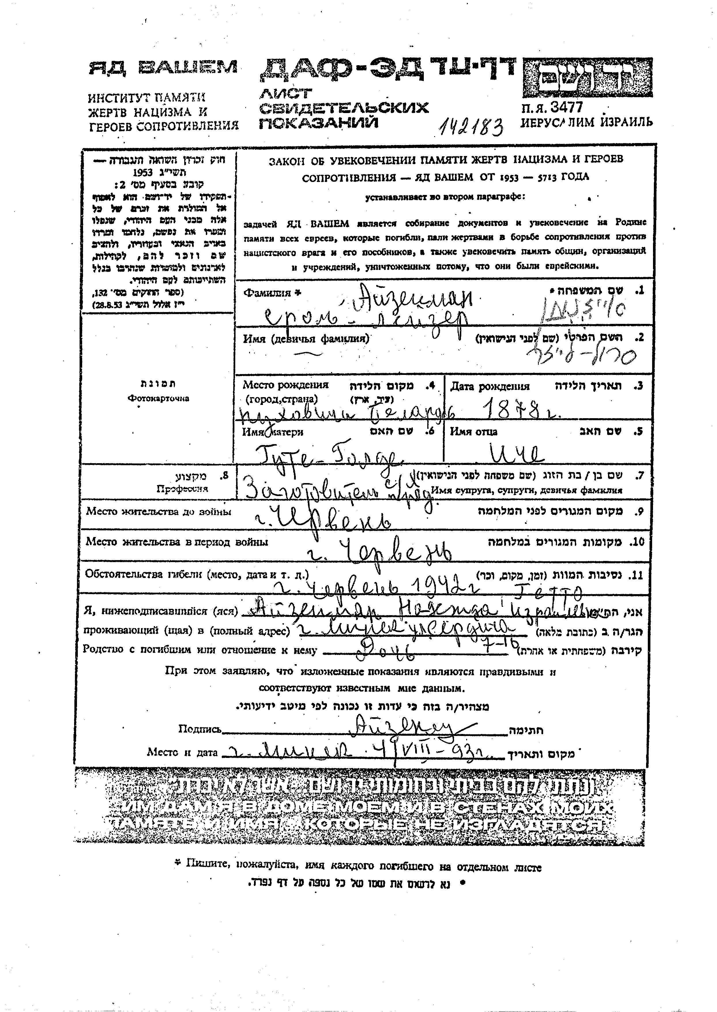 Srol Leizer Ayzenman wurde im Jahr 1878 in Pukhovichi, Weißrussland (UdSSR) geboren. Er war der Sohn von Iche und Gute Golda. Er war Lieferant. Vor dem Zweiten Weltkrieg lebte er in Cherven, Weißrussland (UdSSR). Während des Krieges war er in Cherven, Weißrussland (UdSSR).