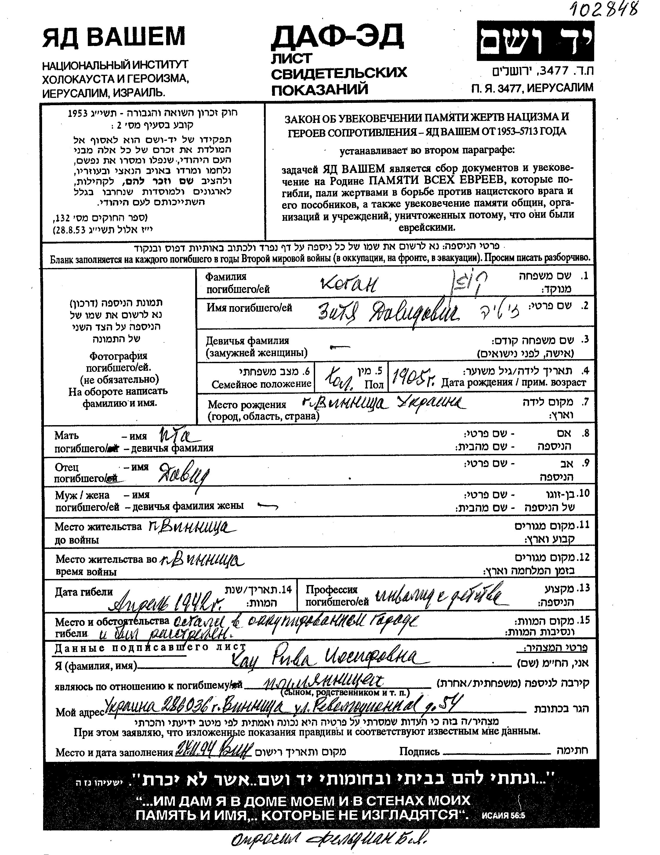 Zitya Kogan wurde im Jahr 1905 in Vinnitsa, Ukraine (UdSSR) geboren. Er war der Sohn von David und Ita. Er war Behindert und Ledig. Vor dem Zweiten Weltkrieg lebte er in Vinnitsa, Ukraine (UdSSR). Während des Krieges war er in Vinnitsa, Ukraine (UdSSR).