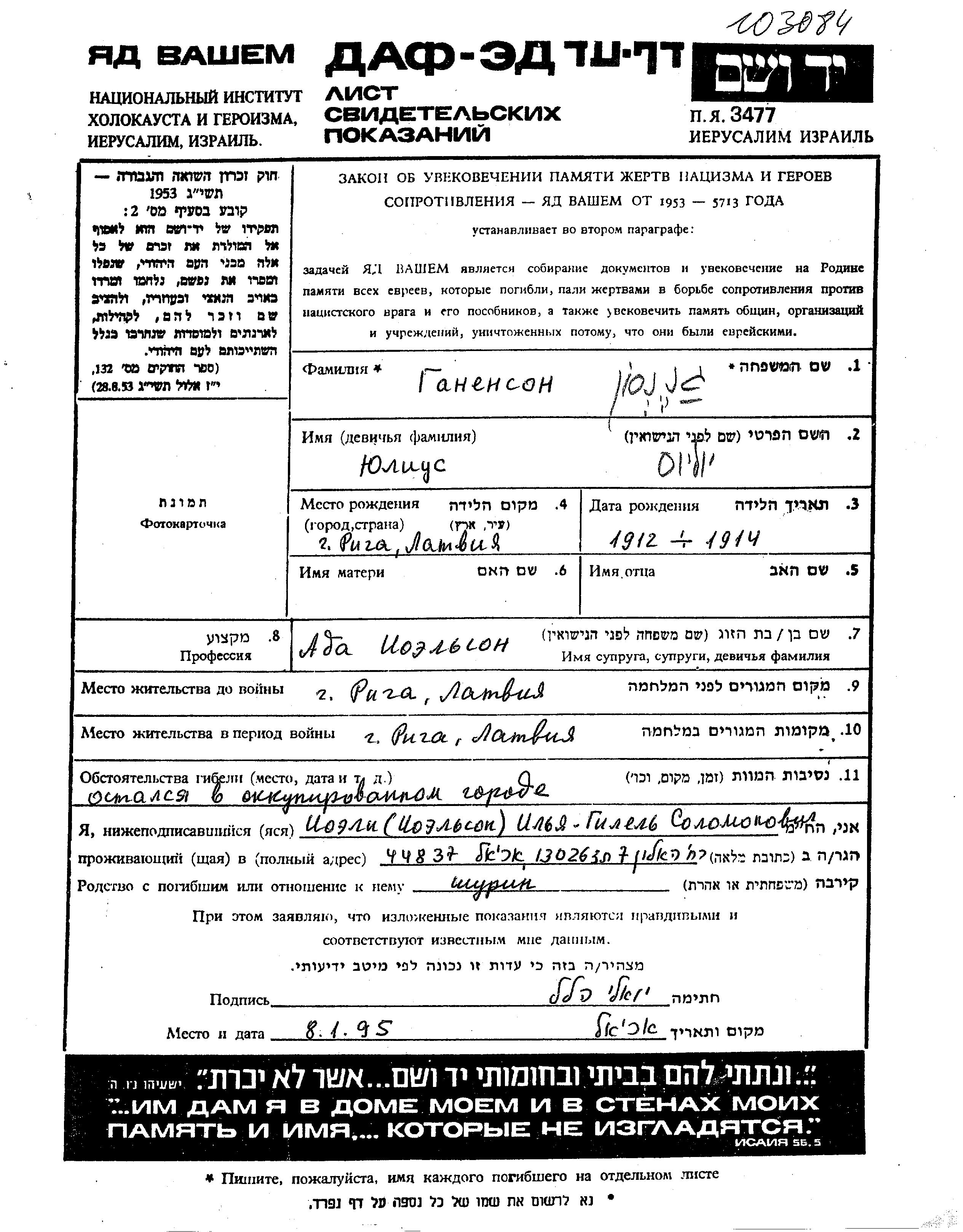 Yulius Ganenson wurde im Jahr 1912 in Riga, Lettland geboren. Er war mit Ede Ada Verheiratet. Vor dem Zweiten Weltkrieg lebte er in Riga, Lettland. Während des Krieges war er in Riga, Lettland.