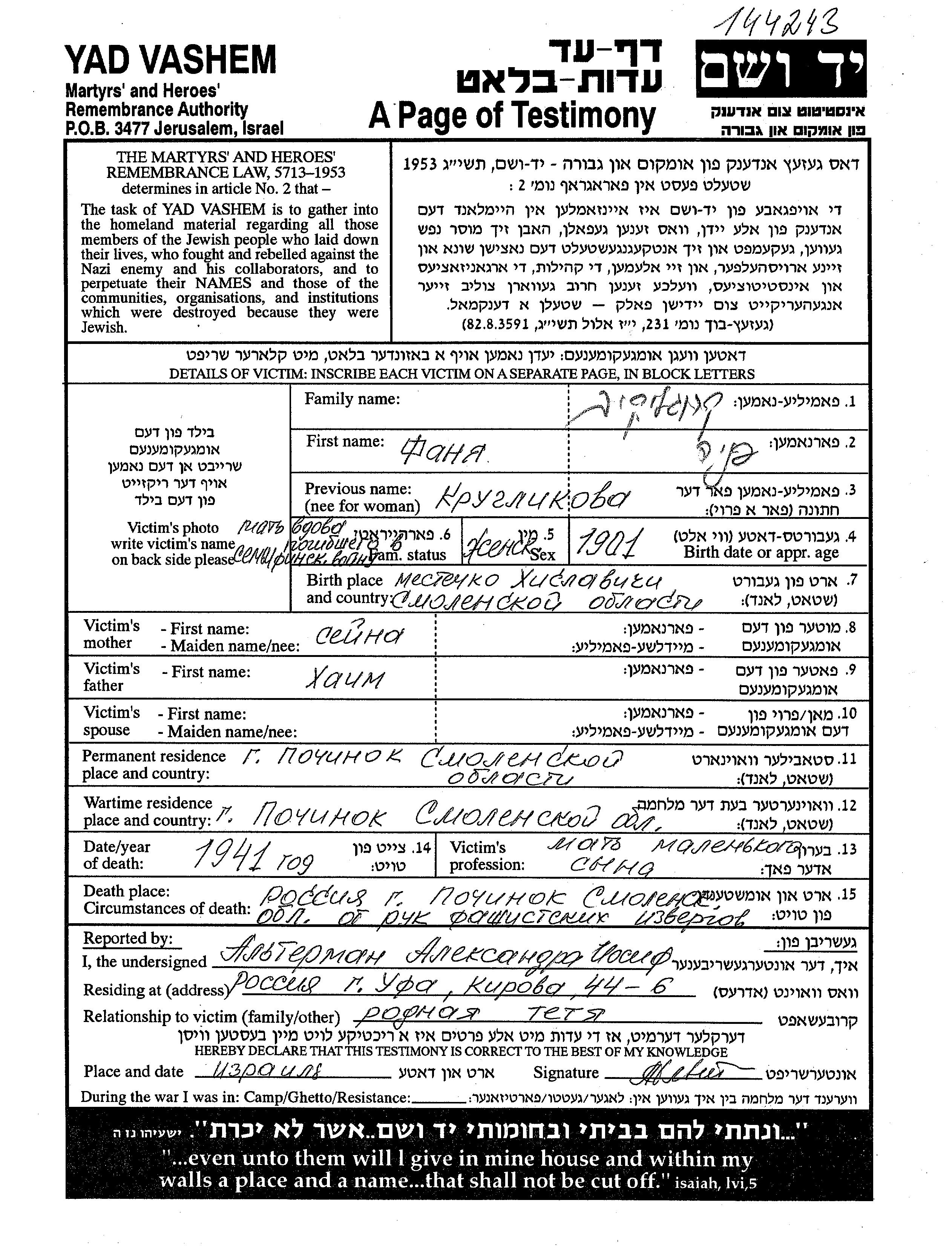 Fania Kruglikov wurde im Jahr 1901 in Khislavichi, Russland (UdSSR) geboren. Sie war die Tochter von Khaim und Seina. Sie war Verwitwet. Vor dem Zweiten Weltkrieg lebte sie in Pochinok, Russland (UdSSR). Während des Krieges war sie in Pochinok, Russland (UdSSR).