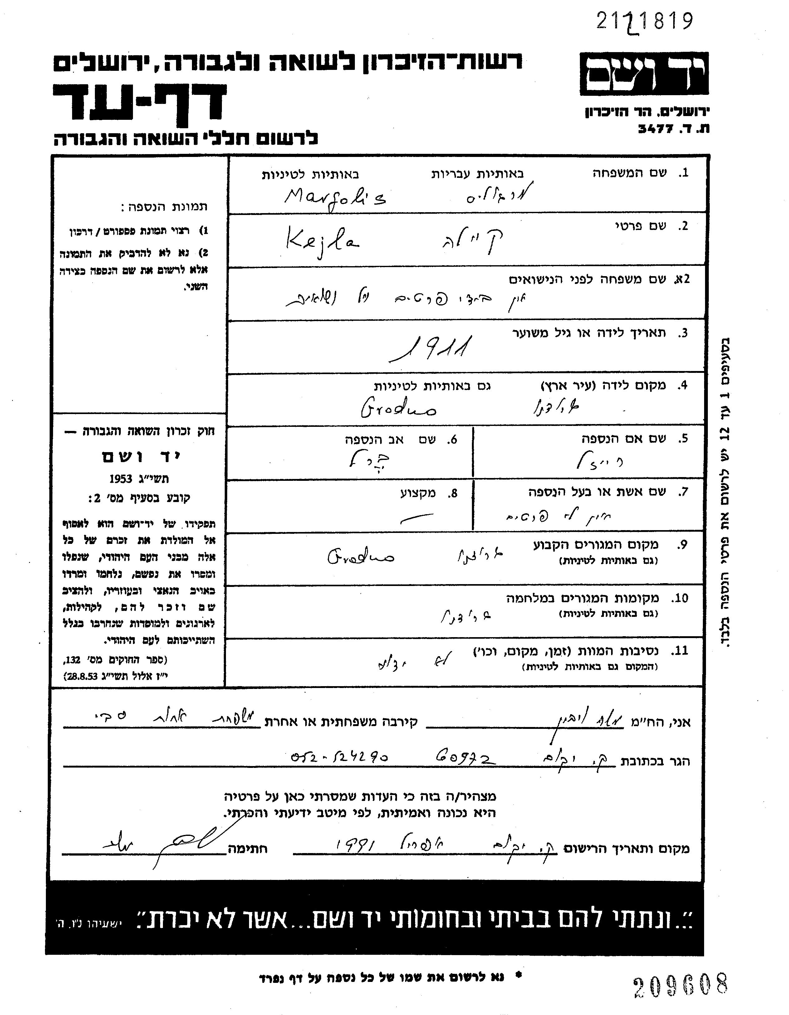 Kejla Margolis wurde im Jahr 1911 in Grodno, Polen geboren. Sie war die Tochter von Berl und Reisl, geb. Pik. Vor dem Zweiten Weltkrieg lebte sie in Grodno, Polen. Während des Krieges war sie in Grodno, Polen.