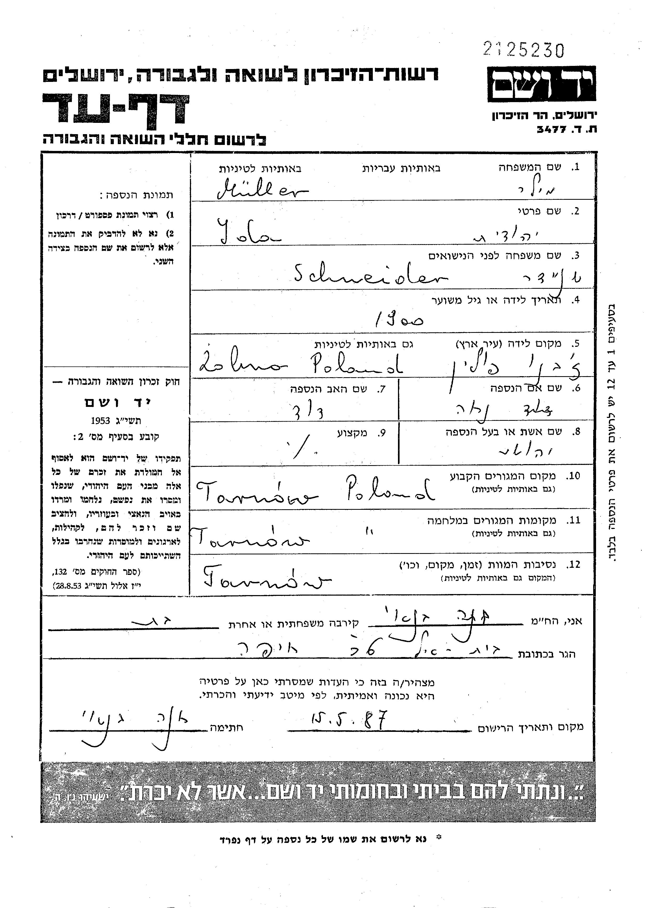Ida Yehudit Müller, geb. Schneider wurde im Jahr 1900 in Zabno, Polen geboren. Sie war die Tochter von David und Nekha. Sie war mit Osiasz Yehoshua Verheiratet. Vor dem Zweiten Weltkrieg lebte sie in Tarnow, Polen. Während des Krieges war sie in Tarnow, Polen.