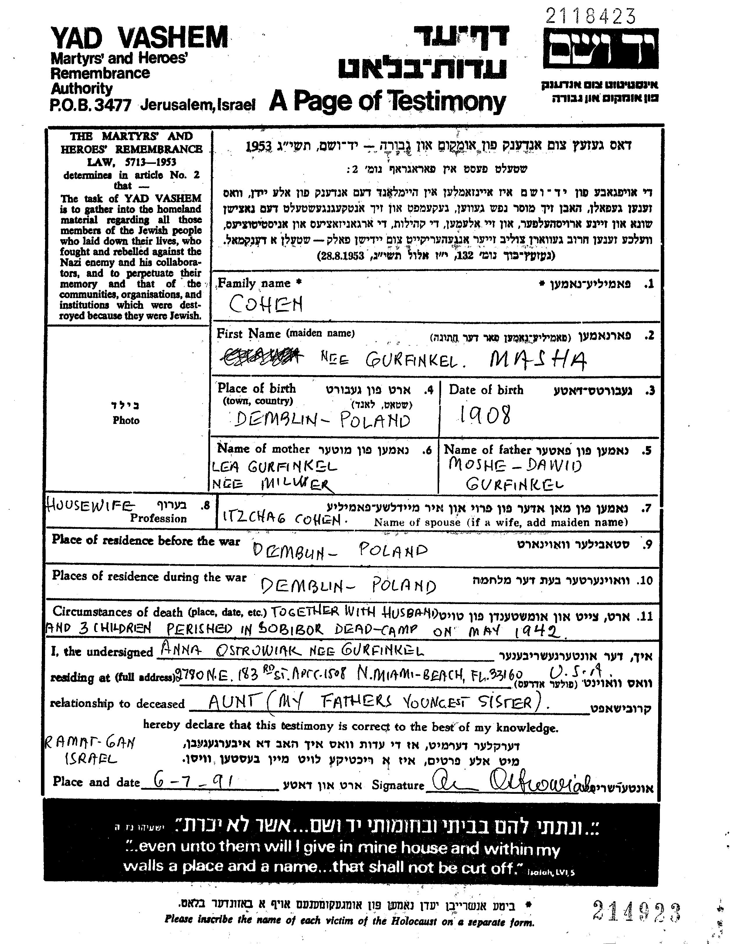 Masha Cohen, geb. Gurfinkel wurde in Deblin, Polen geboren. Sie war die Tochter von Moshe Dawid und Lea, geb. Milwer. Sie war mit Itzchag Verheiratet. Vor dem Zweiten Weltkrieg lebte sie in Deblin, Polen. Während des Krieges war sie in Deblin, Polen.