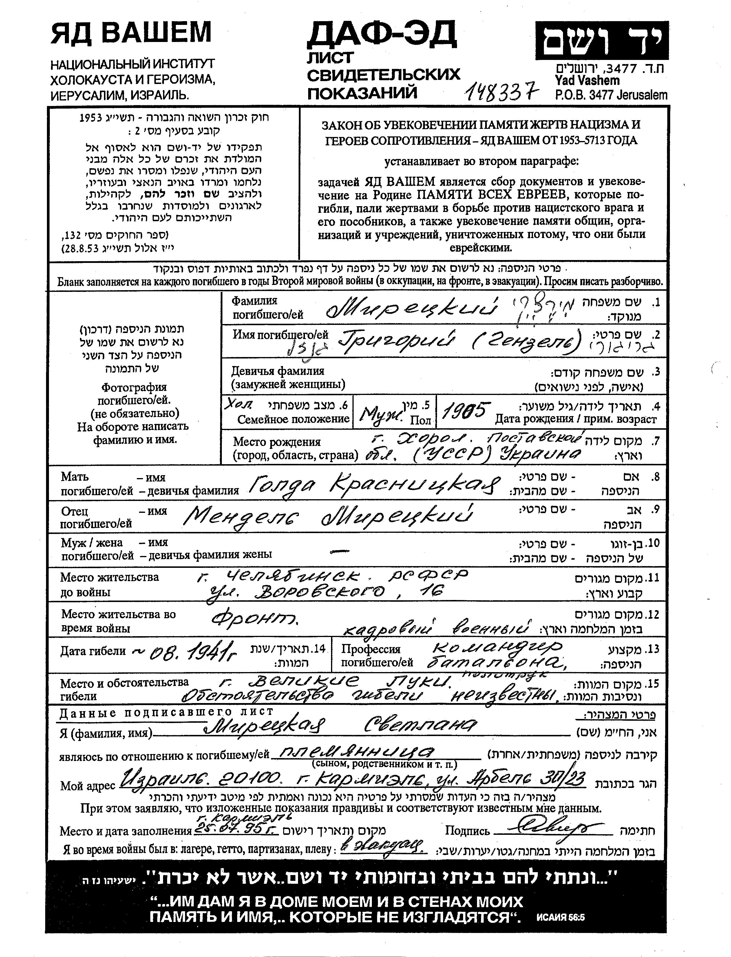 Grigori Genzel Miretzki wurde im Jahr 1905 in Khorol, Ukraine (UdSSR) geboren. Er war der Sohn von Mendel und Golda, geb. Krasnitzki. Er war Offizier und Ledig. Vor dem Zweiten Weltkrieg lebte er in Chelyabinsk, Russland (UdSSR). Während des Krieges war er in die Sowjetischen Streitkräfte. Grigori Genzel im Militärdienst umgekommen. Todesort: Velikiye Luki, Russland (UdSSR) im Jahr 1941.
