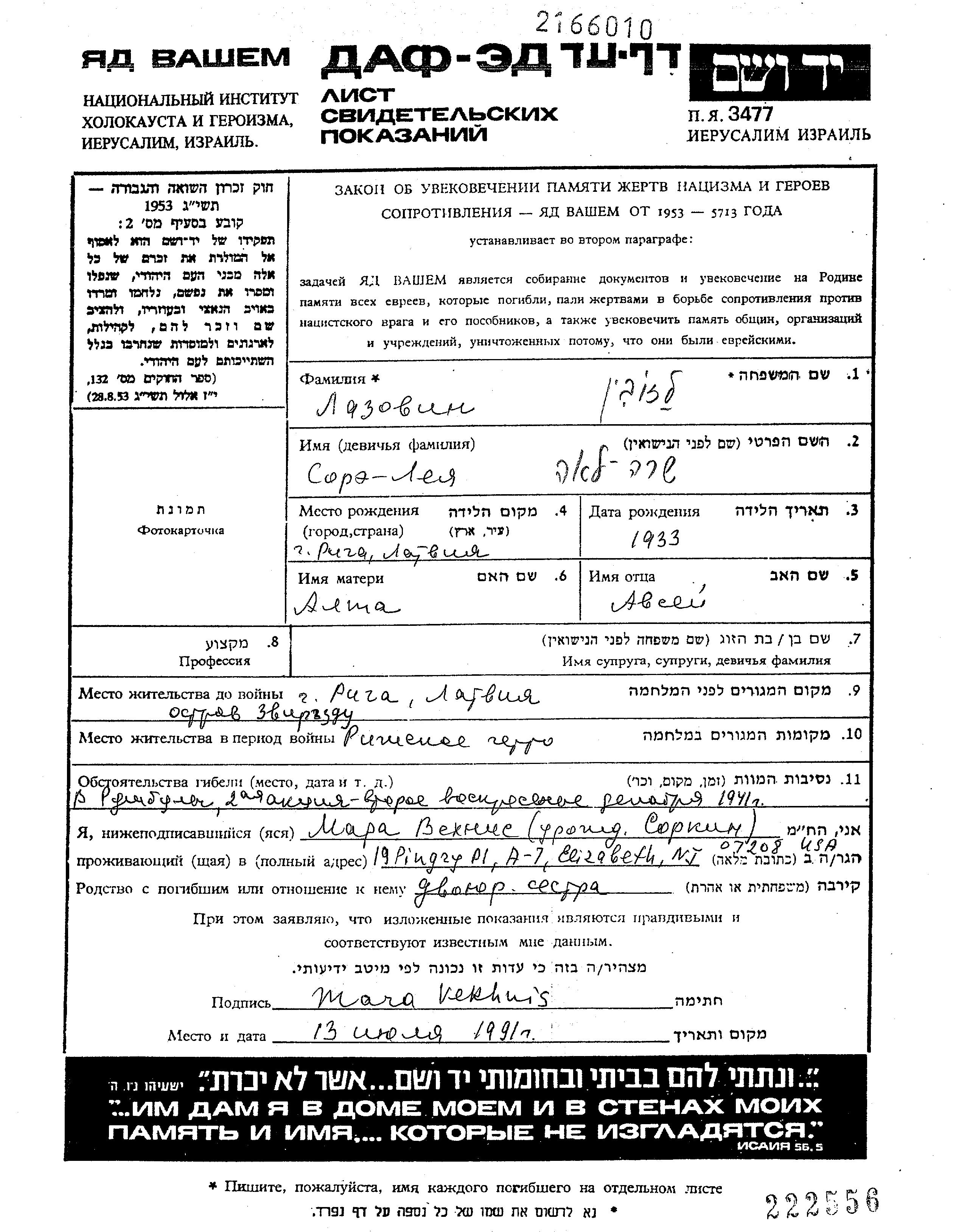 Sore Leia wurde in der Schoah ermordet. Todesort: Rumbule, Massaker Ort im Jahr 14/12/1941.