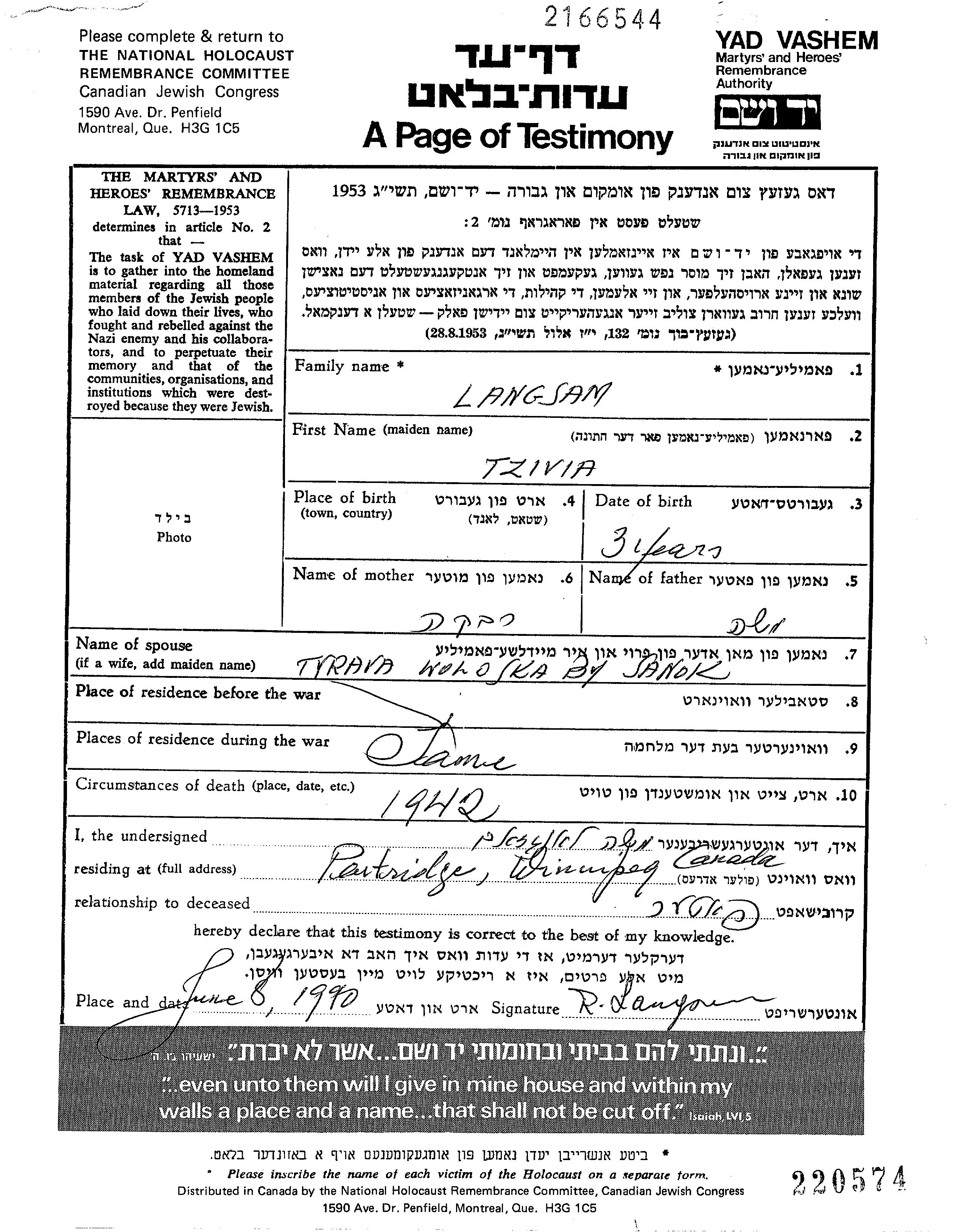 Tzvia Langsam wurde im Jahr 1939 geboren. Sie war die Tochter von Moshe und Rivka. Sie war Kind. Vor dem Zweiten Weltkrieg lebte sie in Tyrawa Woloska, Polen. Während des Krieges war sie in Tyrawa Woloska, Polen.