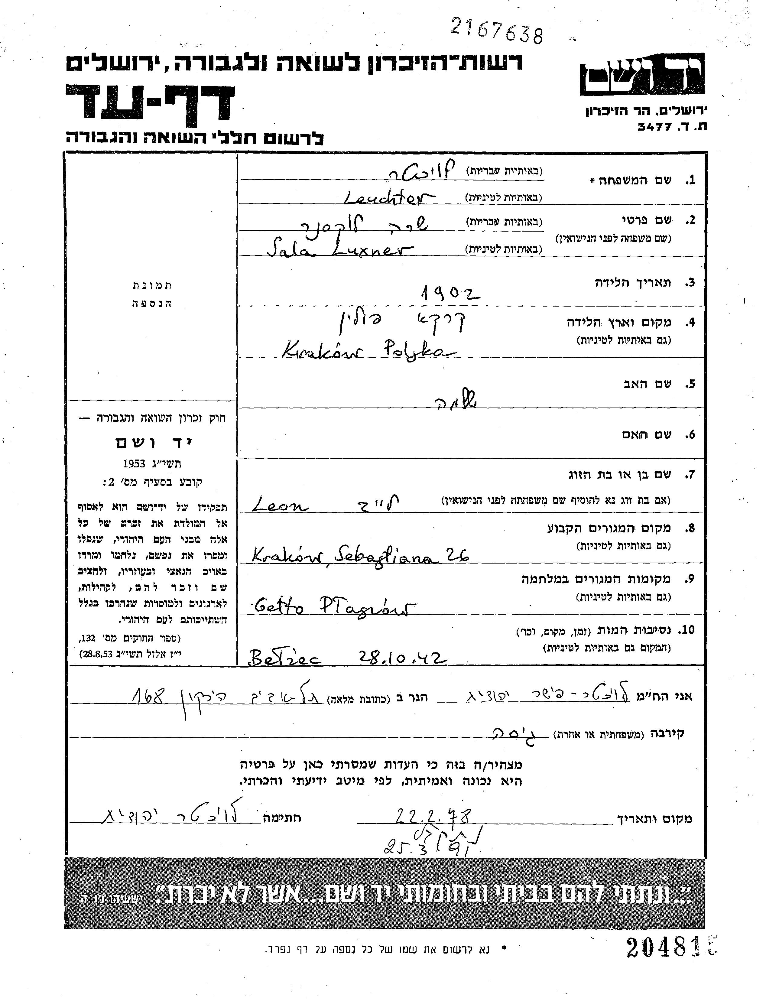 Sala Sara Leuchter, geb. Luxner wurde im Jahr 1902 in Krakow, Polen geboren. Sie war die Tochter von Shlomo. Sie war mit Leib Leon Verheiratet. Vor dem Zweiten Weltkrieg lebte sie in Krakow, Polen. Während des Krieges war sie in Plaszow, Polen.