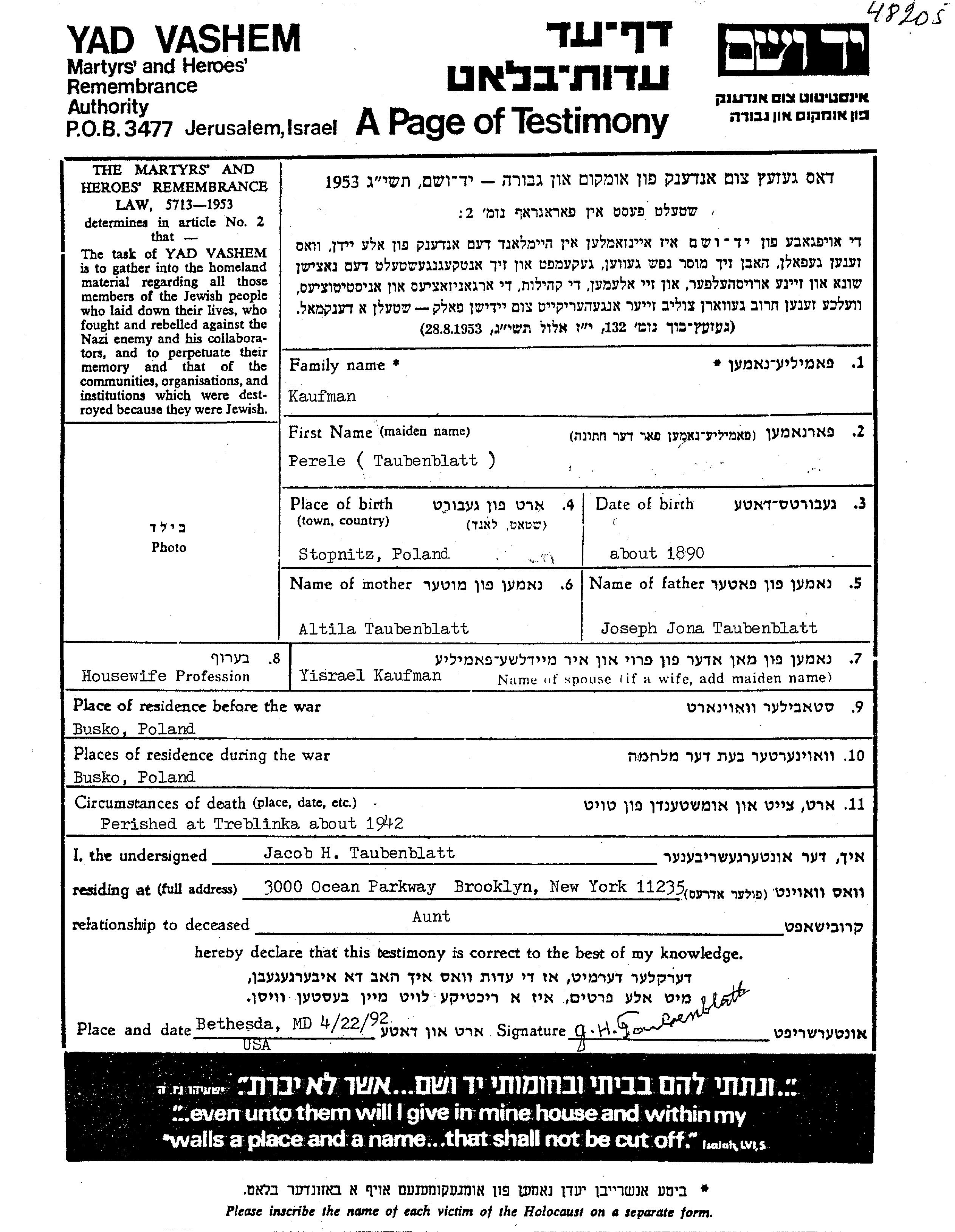 Perele Kaufman, geb. Taubenblatt wurde im Jahr 1890 in Stopnica, Polen geboren. Sie war die Tochter von Joseph Yona und Altila. Sie war Hausfrau und mit Yisrael Verheiratet. Vor dem Zweiten Weltkrieg lebte sie in Busko Zdroj, Polen. Während des Krieges war sie in Busko Zdroj, Polen.