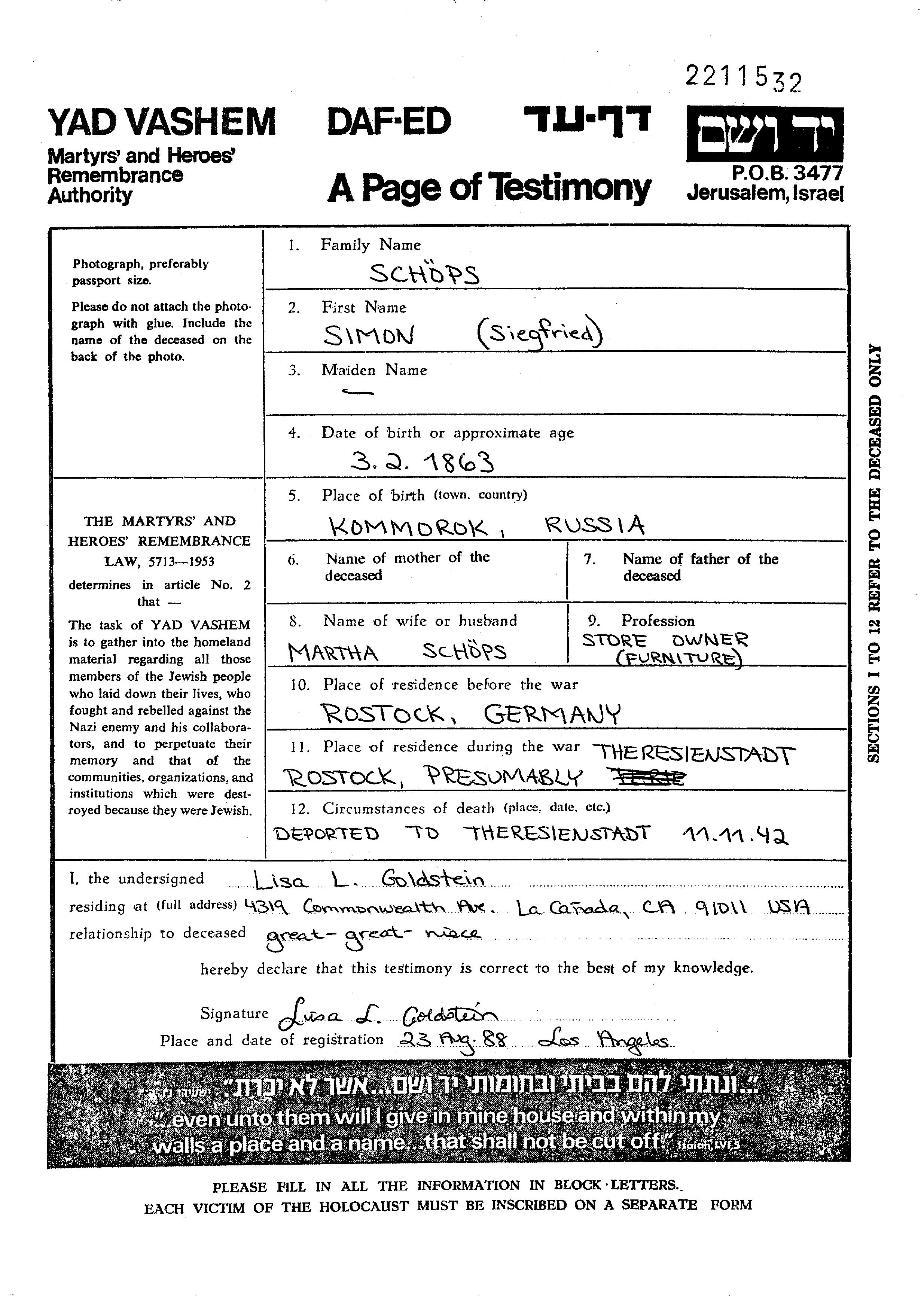 Siegfried Simon Schoeps wurde im Jahr 1863 in Komarow, Polen geboren. Er war Ladenbesitzer/-in und mit Marta Verheiratet. Vor dem Zweiten Weltkrieg lebte er in Rostock, Deutsches Reich. Während des Krieges war er in Rostock, Deutsches Reich.