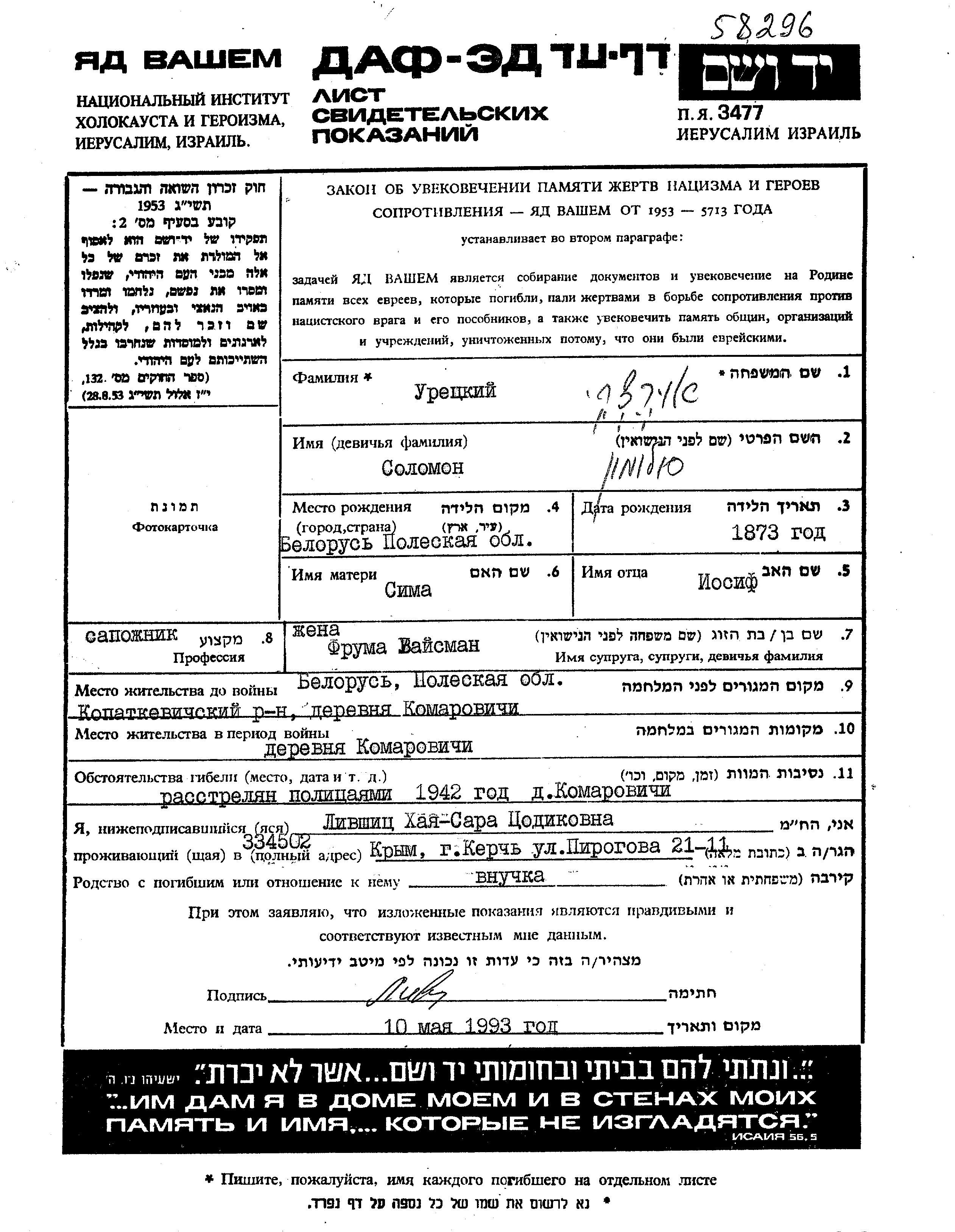 Solomon Uretzki wurde im Jahr 1873 in Polesye, Weißrussland (UdSSR) geboren. Er war der Sohn von Iosif und Sima. Er war Schuster/-in und mit Fruma Verheiratet. Vor dem Zweiten Weltkrieg lebte er in Komarovichi, Weißrussland (UdSSR). Während des Krieges war er in Komarovichi, Weißrussland (UdSSR).