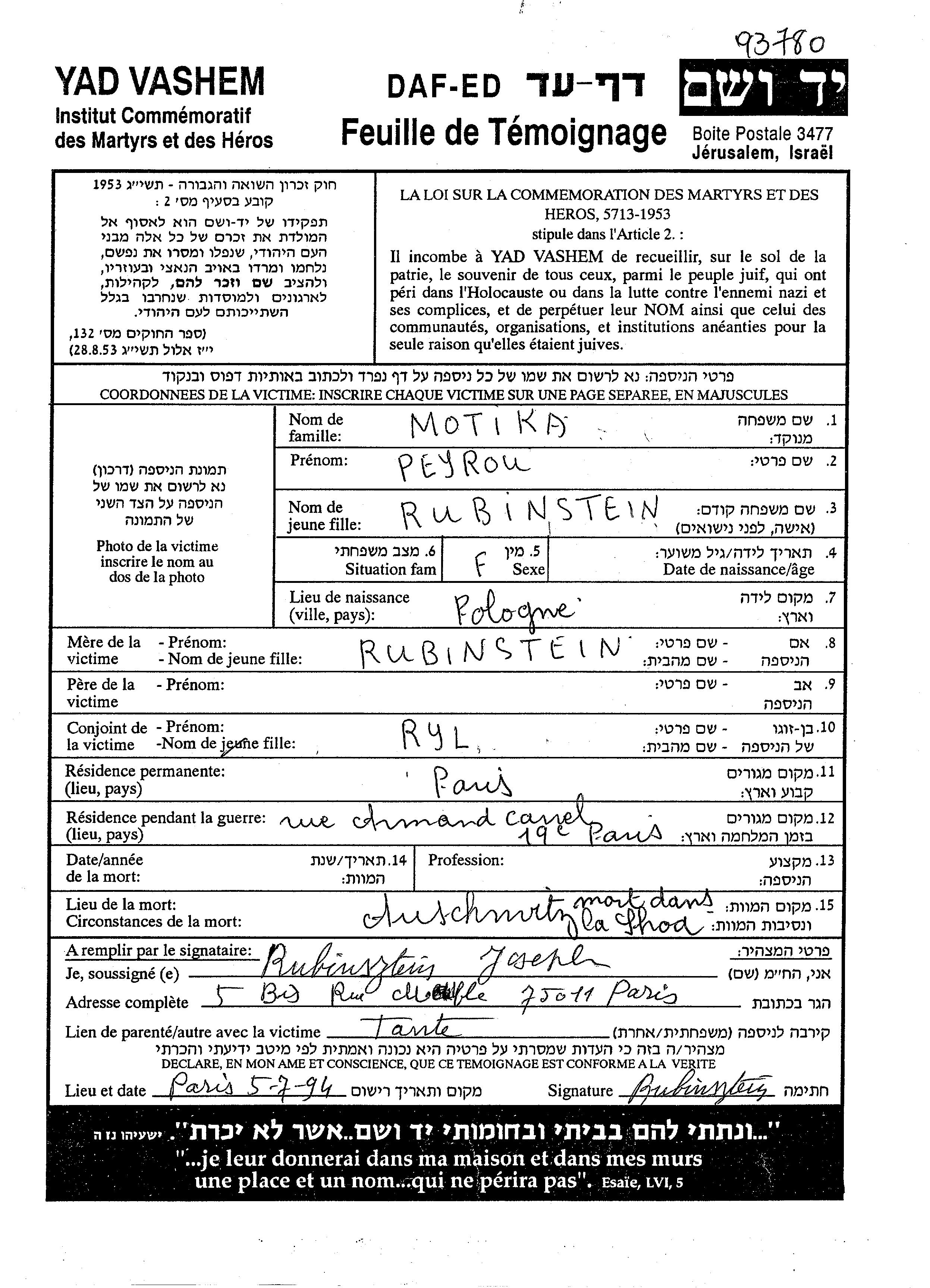 Peyrou Motika, geb. Rubinstein wurde in Polen geboren. Sie war mit Ryl Verheiratet. Vor dem Zweiten Weltkrieg lebte sie in Paris, Frankreich. Während des Krieges war sie in Paris, Frankreich.