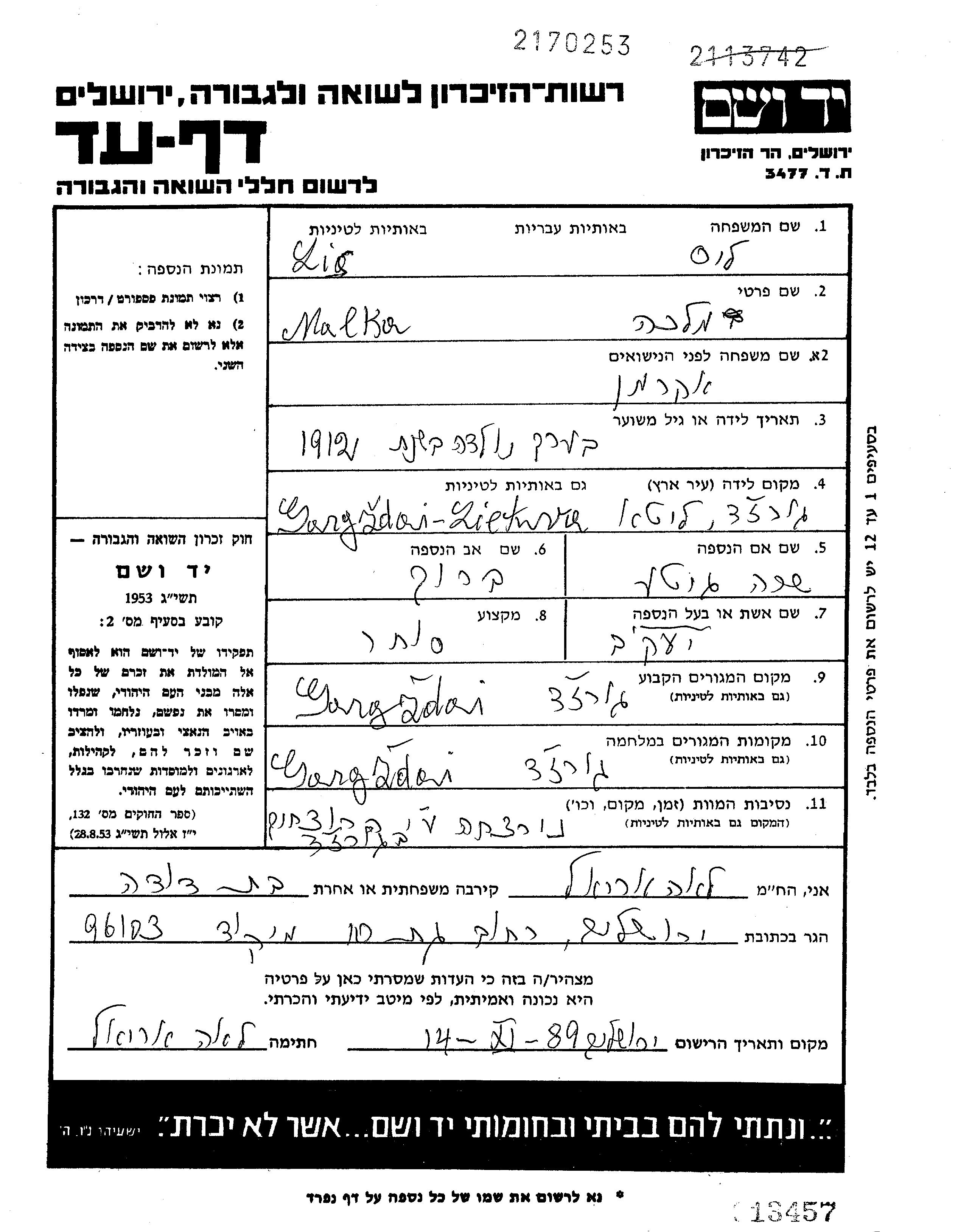 Malka Lis, geb. Akerman wurde im Jahr 1912 in Gargzdai, Litauen geboren. Sie war die Tochter von Barukh und Gite Sara. Sie war Kaufmann/-frau und mit Yaakov Verheiratet. Vor dem Zweiten Weltkrieg lebte sie in Gargzdai, Litauen. Während des Krieges war sie in Gargzdai, Litauen.