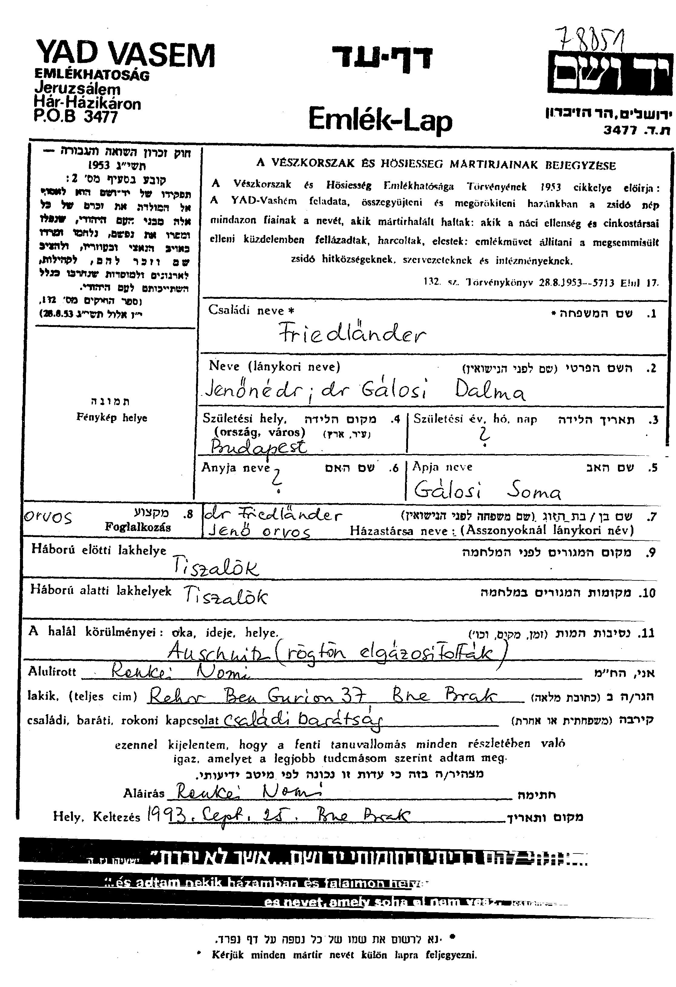 Dr. Dalma Friedlander, geb. Galosi wurde in Budapest, Ungarn geboren. Sie war die Tochter von Soma Shoma. Sie war Arzt/ärztin und mit Jeno Verheiratet. Vor dem Zweiten Weltkrieg lebte sie in Tiszalok, Ungarn. Während des Krieges war sie in Tiszalok, Ungarn.