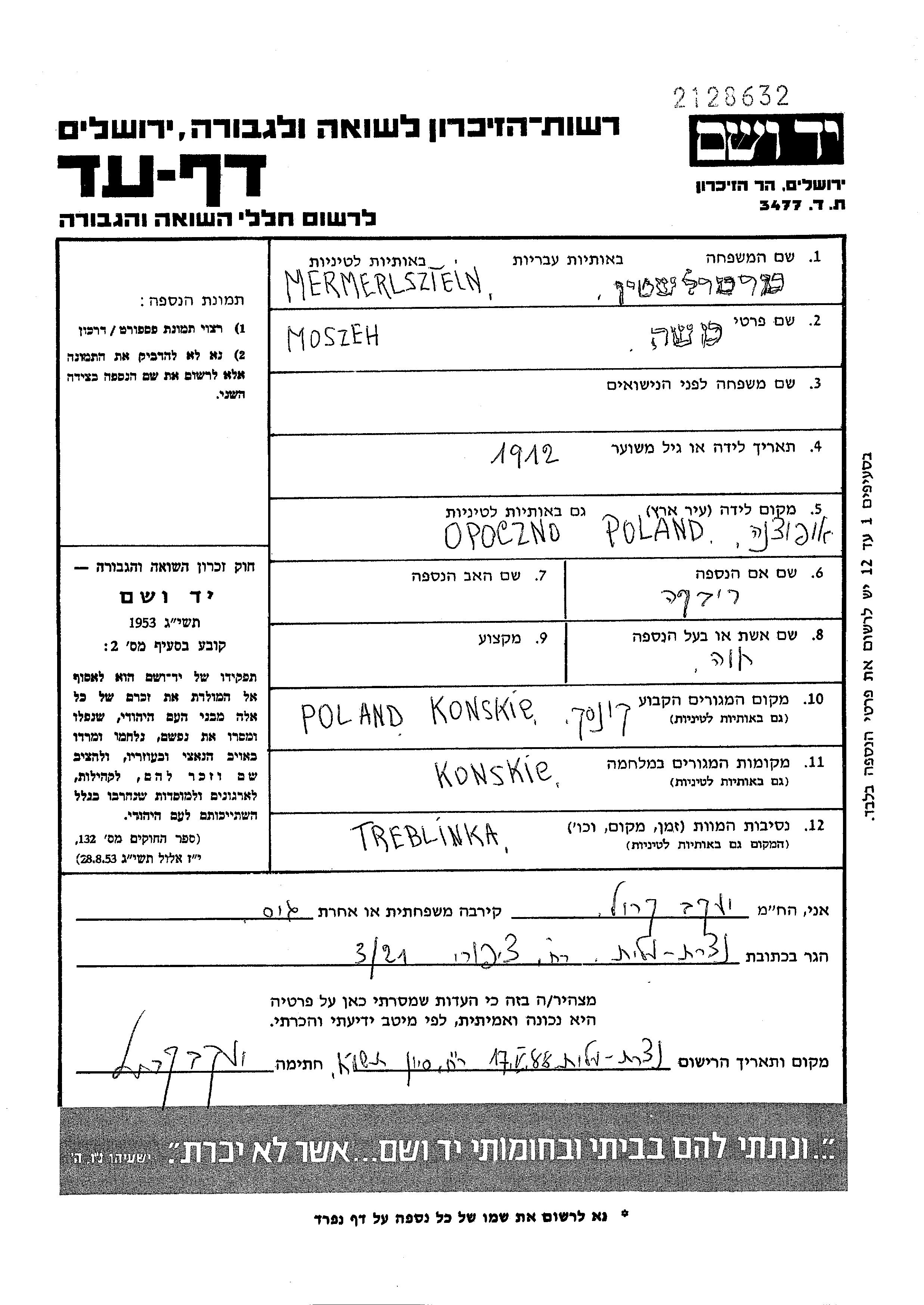 Mermelsztein Moszeh 1912 Konskie, Polen Gedenkblatt