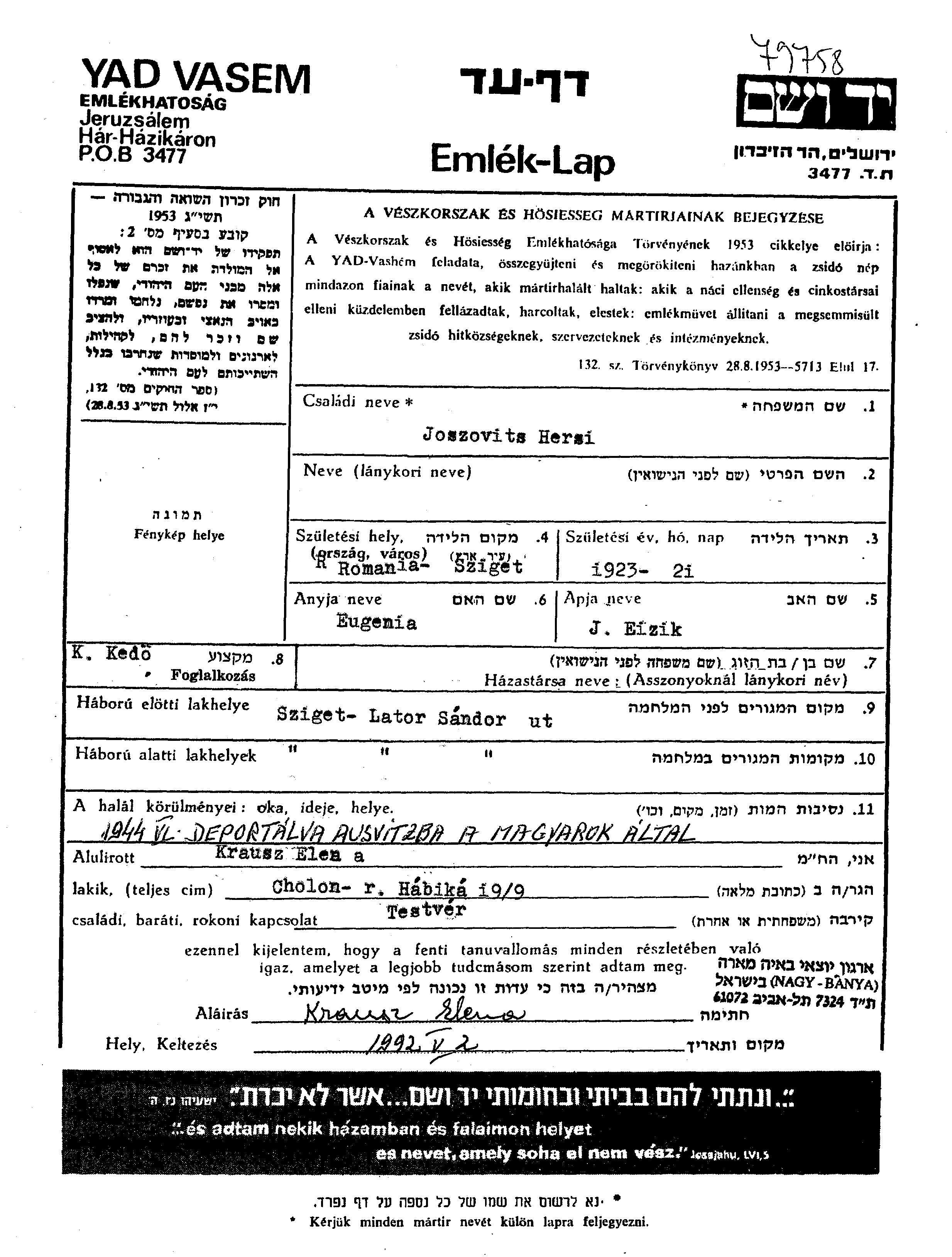 Hersi Joszovits wurde im Jahr 1923 in Maramarossziget, Rumänien geboren. Er war der Sohn von Aizik und Eugenia. Er war Kaufmann/-frau und Ledig. Vor dem Zweiten Weltkrieg lebte er in Maramarossziget, Rumänien. Während des Krieges war er in Maramarossziget, Rumänien.