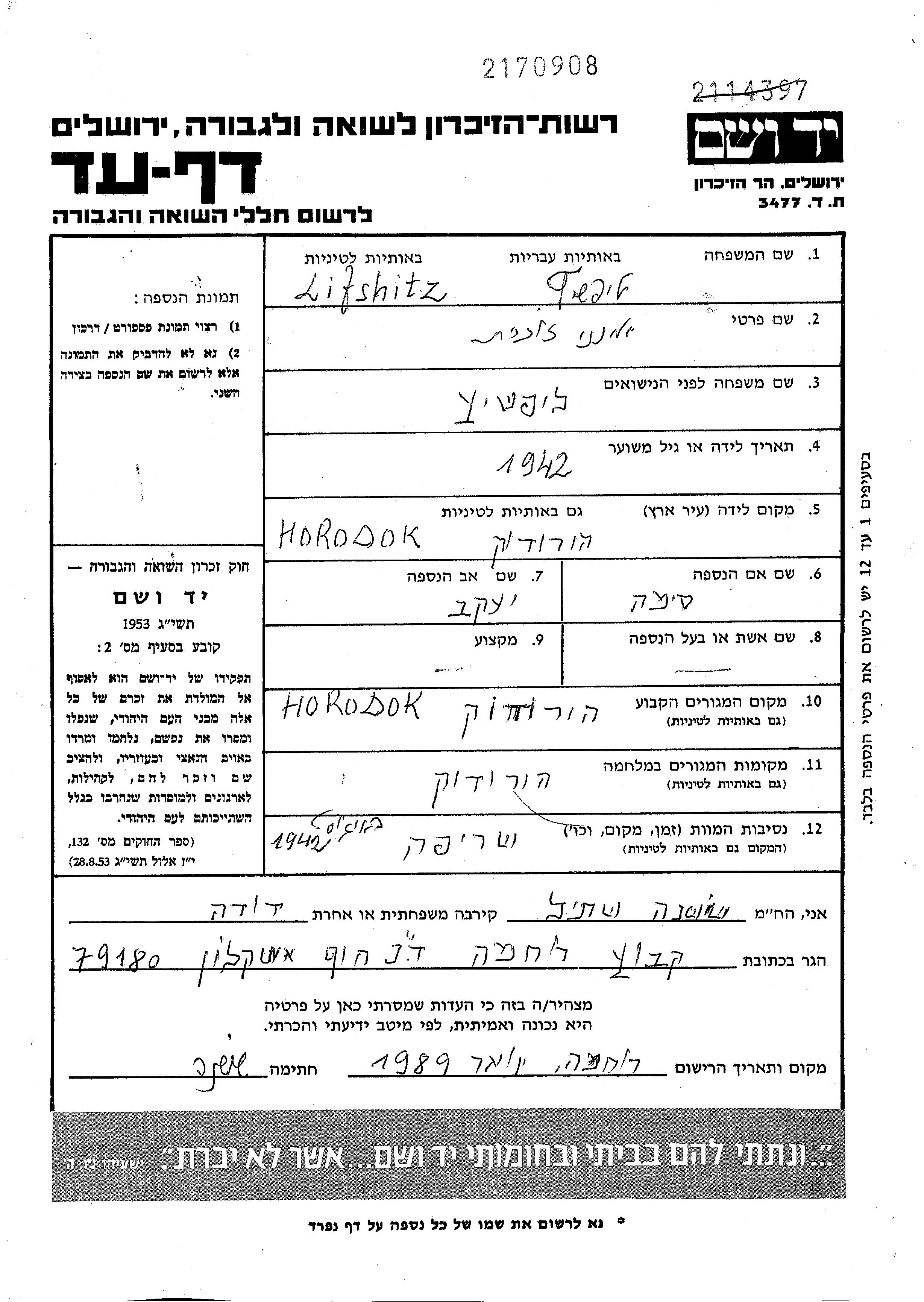 Lifszitz Vorname unbekannt 1942 Horodek, Polen Gedenkblatt