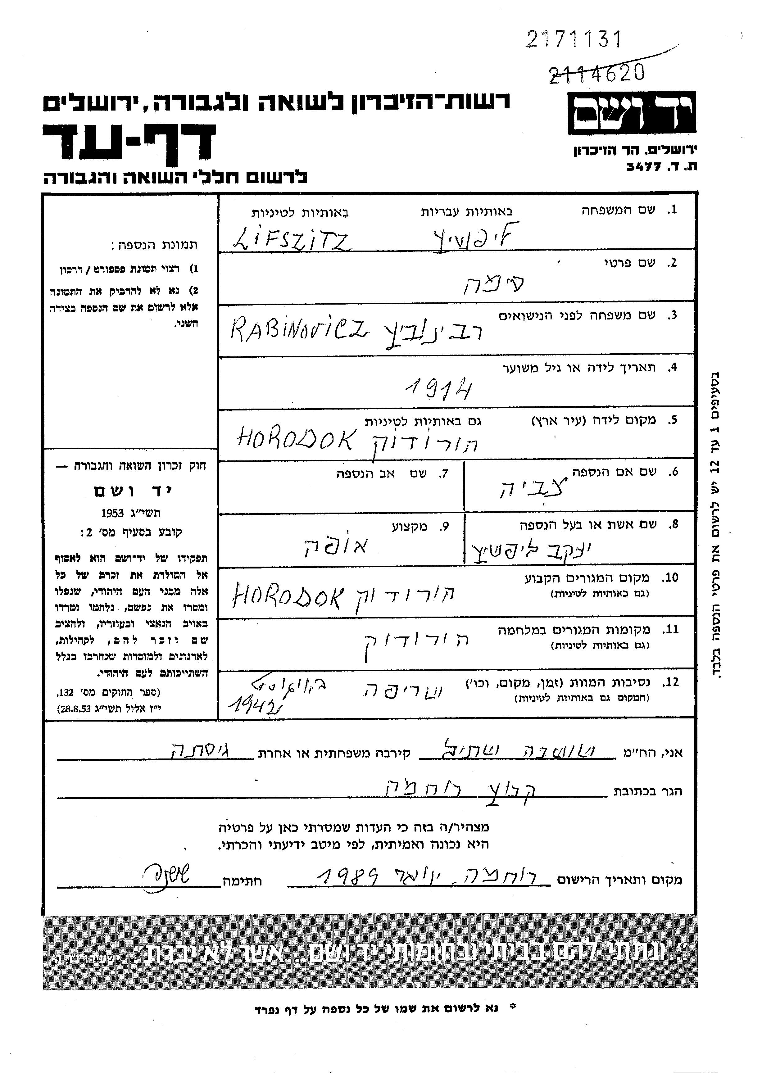 Sima Lifszitz, geb. Rabinovicz wurde im Jahr 1914 in Horodek, Polen geboren. Sie war die Tochter von Tzvia. Sie war Bäcker/-in und mit Yaakov Verheiratet. Vor dem Zweiten Weltkrieg lebte sie in Horodek, Polen. Während des Krieges war sie in Horodek, Polen.